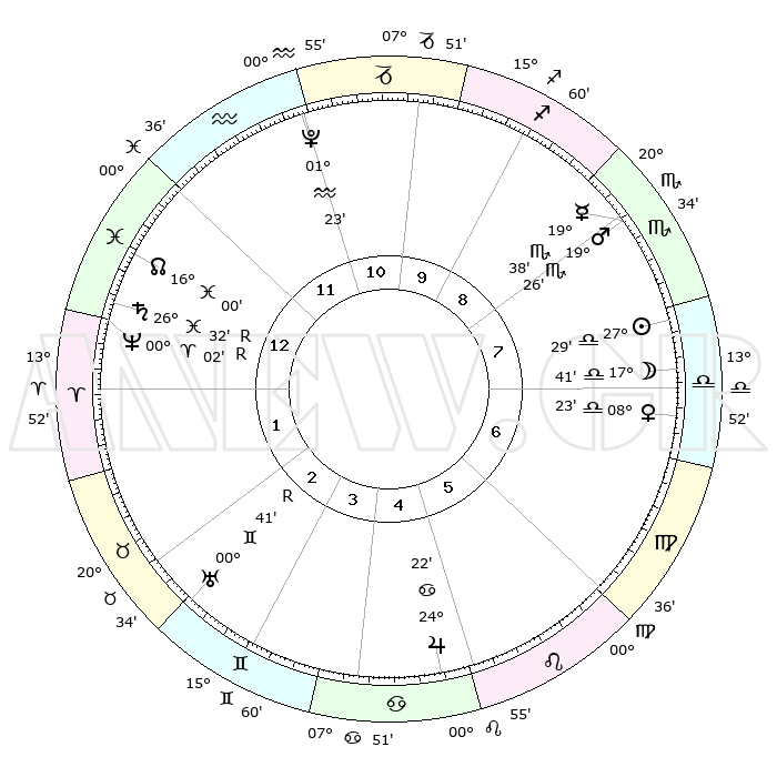 | ΘΕΣΕΙΣ ΠΛΑΝΗΤΩΝ ΑΣΤΡΟΛΟΓΙΚΟΥ ΧΑΡΤΗ ΤΗΣ ΣΤΙΓΜΗΣ ΑΥΤΗΣ | | Πλανήτης | Ζώδιο | Μοίρες | Δεκαήμ. | Σε οίκο | Απόκλιση | | Ακμές των οίκων | Ηλιος | Ζυγός | 27°22' | Τρίτο | 8 | 10 S 32 | | 1ος | 10°37' | Υδροχόος | Σελήνη | Ζυγός | 16°18' | Δεύτερο | 8 | 08 S 41 | | 2ος | 26°02' | Ιχθείς | Ερμής | Σκορπιός | 19°29' | Δεύτερο | 9 | 19 S 47 | | 3ος | 02°37' | Ταύρος | Αφροδίτη | Ζυγός | 08°15' | Πρώτο | 8 | 01 S 51 | | 4ος | 29°23' | Ταύρος | Αρης | Σκορπιός | 19°21' | Δεύτερο | 9 | 17 S 50 | | 5ος | 21°31' | Δίδυμοι | Δίας | Καρκίνος | 24°22' | Τρίτο | 6 | 21 N 18 | | 6ος | 13°28' | Καρκίνος | Κρόνος | Ιχθείς | 26°32'R | Τρίτο | 2 | 03 S 40 | | 7ος | 10°37' | Λέων | Ουρανός | Δίδυμοι | 00°41'R | Πρώτο | 4 | 20 N 05 | | 8ος | 26°02' | Παρθένος | Ποσειδώνας | Κριός | 00°02'R | Πρώτο | 2 | 01 S 15 | | 9ος | 02°37' | Σκορπιός | Πλούτωνας | Υδροχόος | 01°23' | Πρώτο | 12 | 23 S 32 | | 10ος | 29°23' | Σκορπιός | Β. Δεσμός | Ιχθείς | 16°00' | Δεύτερο | 1 | 05 S 31 | | 11ος | 21°31' | Τοξότης | Ωροσκόπος | Υδροχόος | 10°37' | Δεύτερο | | | 12ος | 13°28' | Αιγόκερως | Μεσουράνημα | Σκορπιός | 29°23' | Τρίτο | | | |