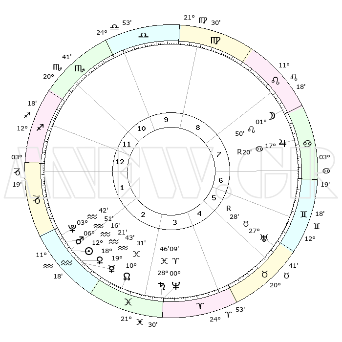 | | ΘΕΣΕΙΣ ΠΛΑΝΗΤΩΝ ΑΣΤΡΟΛΟΓΙΚΟΥ ΧΑΡΤΗ ΤΗΣ ΣΤΙΓΜΗΣ ΑΥΤΗΣ | | | | Πλανήτης | Ζώδιο | Μοίρες | Δεκαήμ. | Σε οίκο | Απόκλιση | | Ακμές των οίκων | | Ηλιος | Υδροχόος | 12°00' | Δεύτερο | 4 | 17 S 11 | | 1ος | 16°34' | Ζυγός | | Σελήνη | Καρκίνος | 28°08' | Τρίτο | 10 | 23 N 53 | | 2ος | 14°13' | Σκορπιός | | Ερμής | Υδροχόος | 19°16' | Δεύτερο | 4 | 16 S 50 | | 3ος | 15°19' | Τοξότης | | Αφροδίτη | Υδροχόος | 18°02' | Δεύτερο | 4 | 16 S 43 | | 4ος | 18°45' | Αιγόκερως | | Αρης | Υδροχόος | 06°38' | Πρώτο | 4 | 19 S 37 | | 5ος | 21°42' | Υδροχόος | | Δίας | Καρκίνος | 17°22'R | Δεύτερο | 9 | 22 N 36 | | 6ος | 21°22' | Ιχθείς | | Κρόνος | Ιχθείς | 28°45' | Τρίτο | 6 | 02 S 30 | | 7ος | 16°34' | Κριός | | Ουρανός | Ταύρος | 27°28'R | Τρίτο | 8 | 19 N 24 | | 8ος | 14°13' | Ταύρος | | Ποσειδώνας | Κριός | 00°08' | Πρώτο | 6 | 01 S 09 | | 9ος | 15°19' | Δίδυμοι | | Πλούτωνας | Υδροχόος | 03°42' | Πρώτο | 4 | 23 S 01 | | 10ος | 18°45' | Καρκίνος | | Β. Δεσμός | Ιχθείς | 10°32' | Δεύτερο | 5 | 07 S 37 | | 11ος | 21°42' | Λέων | | Ωροσκόπος | Ζυγός | 16°34' | Δεύτερο | | | 12ος | 21°22' | Παρθένος | | Μεσουράνημα | Καρκίνος | 18°45' | Δεύτερο | | | |