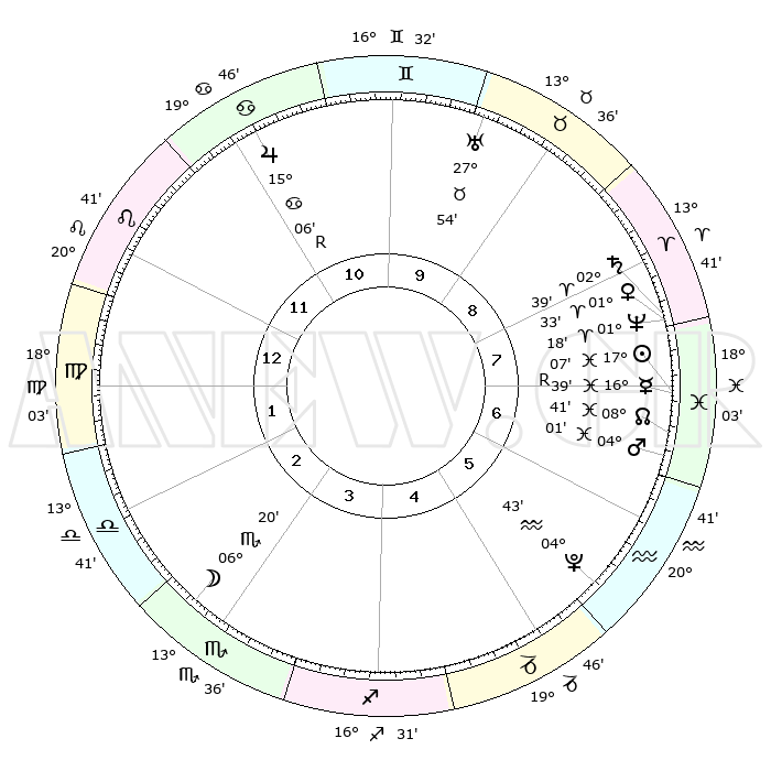 | | ΘΕΣΕΙΣ ΠΛΑΝΗΤΩΝ ΑΣΤΡΟΛΟΓΙΚΟΥ ΧΑΡΤΗ ΤΗΣ ΣΤΙΓΜΗΣ ΑΥΤΗΣ | | | | Πλανήτης | Ζώδιο | Μοίρες | Δεκαήμ. | Σε οίκο | Απόκλιση | | Ακμές των οίκων | | Ηλιος | Ιχθείς | 17°03' | Δεύτερο | 7 | 05 S 07 | | 1ος | 01°22' | Παρθένος | | Σελήνη | Σκορπιός | 05°39' | Πρώτο | 3 | 17 S 33 | | 2ος | 25°22' | Παρθένος | | Ερμής | Ιχθείς | 16°43'R | Δεύτερο | 7 | 01 S 54 | | 3ος | 24°10' | Ζυγός | | Αφροδίτη | Κριός | 01°29' | Πρώτο | 8 | 00 S 33 | | 4ος | 27°06' | Σκορπιός | | Αρης | Ιχθείς | 03°59' | Πρώτο | 7 | 11 S 04 | | 5ος | 01°12' | Αιγόκερως | | Δίας | Καρκίνος | 15°06'R | Δεύτερο | 11 | 22 N 56 | | 6ος | 03°03' | Υδροχόος | | Κρόνος | Κριός | 02°38' | Πρώτο | 8 | 00 S 54 | | 7ος | 01°22' | Ιχθείς | | Ουρανός | Ταύρος | 27°54' | Τρίτο | 10 | 19 N 31 | | 8ος | 25°22' | Ιχθείς | | Ποσειδώνας | Κριός | 01°17' | Πρώτο | 8 | 00 S 41 | | 9ος | 24°10' | Κριός | | Πλούτωνας | Υδροχόος | 04°43' | Πρώτο | 6 | 22 S 51 | | 10ος | 27°06' | Ταύρος | | Β. Δεσμός | Ιχθείς | 08°42' | Πρώτο | 7 | 08 S 18 | | 11ος | 01°12' | Καρκίνος | | Ωροσκόπος | Παρθένος | 01°22' | Πρώτο | | | 12ος | 03°03' | Λέων | | Μεσουράνημα | Ταύρος | 27°06' | Τρίτο | | | |