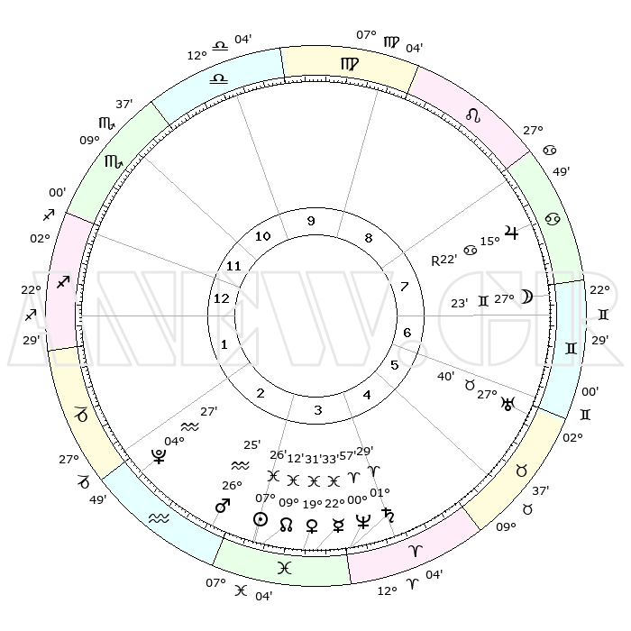 | | ΘΕΣΕΙΣ ΠΛΑΝΗΤΩΝ ΑΣΤΡΟΛΟΓΙΚΟΥ ΧΑΡΤΗ ΤΗΣ ΣΤΙΓΜΗΣ ΑΥΤΗΣ | | | | Πλανήτης | Ζώδιο | Μοίρες | Δεκαήμ. | Σε οίκο | Απόκλιση | | Ακμές των οίκων | | Ηλιος | Ιχθείς | 07°22' | Πρώτο | 3 | 08 S 48 | | 1ος | 05°58' | Τοξότης | | Σελήνη | Δίδυμοι | 26°37' | Τρίτο | 7 | 28 N 25 | | 2ος | 08°00' | Αιγόκερως | | Ερμής | Ιχθείς | 22°33' | Τρίτο | 4 | 00 S 27 | | 3ος | 14°43' | Υδροχόος | | Αφροδίτη | Ιχθείς | 19°27' | Δεύτερο | 3 | 05 S 28 | | 4ος | 20°48' | Ιχθείς | | Αρης | Υδροχόος | 26°22' | Τρίτο | 3 | 13 S 45 | | 5ος | 21°01' | Κριός | | Δίας | Καρκίνος | 15°22'R | Δεύτερο | 8 | 22 N 53 | | 6ος | 15°16' | Ταύρος | | Κρόνος | Κριός | 01°29' | Πρώτο | 4 | 01 S 22 | | 7ος | 05°58' | Δίδυμοι | | Ουρανός | Ταύρος | 27°40' | Τρίτο | 6 | 19 N 28 | | 8ος | 08°00' | Καρκίνος | | Ποσειδώνας | Κριός | 00°56' | Πρώτο | 4 | 00 S 50 | | 9ος | 14°43' | Λέων | | Πλούτωνας | Υδροχόος | 04°27' | Πρώτο | 2 | 22 S 53 | | 10ος | 20°48' | Παρθένος | | Β. Δεσμός | Ιχθείς | 09°12' | Πρώτο | 3 | 08 S 07 | | 11ος | 21°01' | Ζυγός | | Ωροσκόπος | Τοξότης | 05°58' | Πρώτο | | | 12ος | 15°17' | Σκορπιός | | Μεσουράνημα | Παρθένος | 20°48' | Τρίτο | | | |