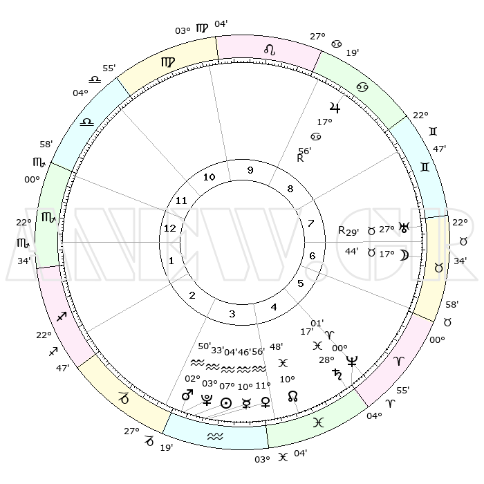 | | ΘΕΣΕΙΣ ΠΛΑΝΗΤΩΝ ΑΣΤΡΟΛΟΓΙΚΟΥ ΧΑΡΤΗ ΤΗΣ ΣΤΙΓΜΗΣ ΑΥΤΗΣ | | | | Πλανήτης | Ζώδιο | Μοίρες | Δεκαήμ. | Σε οίκο | Απόκλιση | | Ακμές των οίκων | | Ηλιος | Υδροχόος | 06°59' | Πρώτο | 4 | 18 S 31 | | 1ος | 01°15' | Σκορπιός | | Σελήνη | Ταύρος | 16°41' | Δεύτερο | 7 | 21 N 25 | | 2ος | 29°44' | Σκορπιός | | Ερμής | Υδροχόος | 10°38' | Δεύτερο | 4 | 19 S 34 | | 3ος | 01°47' | Αιγόκερως | | Αφροδίτη | Υδροχόος | 11°50' | Δεύτερο | 4 | 18 S 28 | | 4ος | 06°04' | Υδροχόος | | Αρης | Υδροχόος | 02°47' | Πρώτο | 3 | 20 S 32 | | 5ος | 08°58' | Ιχθείς | | Δίας | Καρκίνος | 17°57'R | Δεύτερο | 9 | 22 N 31 | | 6ος | 07°31' | Κριός | | Κρόνος | Ιχθείς | 28°16' | Τρίτο | 5 | 02 S 42 | | 7ος | 01°15' | Ταύρος | | Ουρανός | Ταύρος | 27°29'R | Τρίτο | 7 | 19 N 24 | | 8ος | 29°44' | Ταύρος | | Ποσειδώνας | Κριός | 00°01' | Πρώτο | 5 | 01 S 12 | | 9ος | 01°47' | Καρκίνος | | Πλούτωνας | Υδροχόος | 03°32' | Πρώτο | 3 | 23 S 03 | | 10ος | 06°04' | Λέων | | Β. Δεσμός | Ιχθείς | 10°48' | Δεύτερο | 5 | 07 S 31 | | 11ος | 08°58' | Παρθένος | | Ωροσκόπος | Σκορπιός | 01°15' | Πρώτο | | | 12ος | 07°31' | Ζυγός | | Μεσουράνημα | Λέων | 06°04' | Πρώτο | | | |