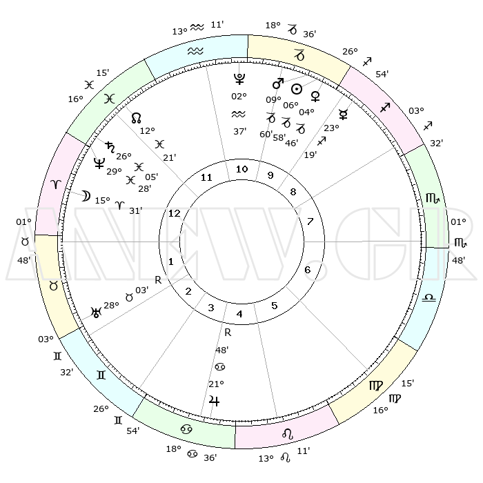 | | ΘΕΣΕΙΣ ΠΛΑΝΗΤΩΝ ΑΣΤΡΟΛΟΓΙΚΟΥ ΧΑΡΤΗ ΤΗΣ ΣΤΙΓΜΗΣ ΑΥΤΗΣ | | | | Πλανήτης | Ζώδιο | Μοίρες | Δεκαήμ. | Σε οίκο | Απόκλιση | | Ακμές των οίκων | | Ηλιος | Αιγόκερως | 06°54' | Πρώτο | 10 | 23 S 15 | | 1ος | 17°06' | Ιχθείς | | Σελήνη | Κριός | 14°26' | Δεύτερο | 1 | 08 N 15 | | 2ος | 00°11' | Ταύρος | | Ερμής | Τοξότης | 23°12' | Τρίτο | 10 | 23 S 25 | | 3ος | 29°42' | Ταύρος | | Αφροδίτη | Αιγόκερως | 04°41' | Πρώτο | 10 | 23 S 43 | | 4ος | 22°43' | Δίδυμοι | | Αρης | Αιγόκερως | 09°56' | Πρώτο | 10 | 23 S 56 | | 5ος | 14°35' | Καρκίνος | | Δίας | Καρκίνος | 21°49'R | Τρίτο | 5 | 21 N 54 | | 6ος | 10°09' | Λέων | | Κρόνος | Ιχθείς | 26°05' | Τρίτο | 1 | 03 S 38 | | 7ος | 17°06' | Παρθένος | | Ουρανός | Ταύρος | 28°03'R | Τρίτο | 2 | 19 N 32 | | 8ος | 00°11' | Σκορπιός | | Ποσειδώνας | Ιχθείς | 29°28' | Τρίτο | 1 | 01 S 26 | | 9ος | 29°42' | Σκορπιός | | Πλούτωνας | Υδροχόος | 02°37' | Πρώτο | 11 | 23 S 15 | | 10ος | 22°43' | Τοξότης | | Β. Δεσμός | Ιχθείς | 12°22' | Δεύτερο | 12 | 06 S 55 | | 11ος | 14°35' | Αιγόκερως | | Ωροσκόπος | Ιχθείς | 17°06' | Δεύτερο | | | 12ος | 10°09' | Υδροχόος | | Μεσουράνημα | Τοξότης | 22°43' | Τρίτο | | | |