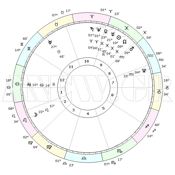 | | ΘΕΣΕΙΣ ΠΛΑΝΗΤΩΝ ΑΣΤΡΟΛΟΓΙΚΟΥ ΧΑΡΤΗ ΤΗΣ ΣΤΙΓΜΗΣ ΑΥΤΗΣ | | | | Πλανήτης | Ζώδιο | Μοίρες | Δεκαήμ. | Σε οίκο | Απόκλιση | | Ακμές των οίκων | | Ηλιος | Ιχθείς | 10°51' | Δεύτερο | 10 | 07 S 30 | | 1ος | 29°15' | Δίδυμοι | | Σελήνη | Λέων | 15°08' | Δεύτερο | 3 | 18 N 20 | | 2ος | 20°06' | Καρκίνος | | Ερμής | Ιχθείς | 21°46'R | Τρίτο | 10 | 00 S 10 | | 3ος | 11°51' | Λέων | | Αφροδίτη | Ιχθείς | 23°46' | Τρίτο | 10 | 03 S 43 | | 4ος | 08°03' | Παρθένος | | Αρης | Υδροχόος | 29°06' | Τρίτο | 9 | 12 S 49 | | 5ος | 11°52' | Ζυγός | | Δίας | Καρκίνος | 15°14'R | Δεύτερο | 1 | 22 N 54 | | 6ος | 21°55' | Σκορπιός | | Κρόνος | Κριός | 01°53' | Πρώτο | 10 | 01 S 12 | | 7ος | 29°15' | Τοξότης | | Ουρανός | Ταύρος | 27°45' | Τρίτο | 12 | 19 N 29 | | 8ος | 20°06' | Αιγόκερως | | Ποσειδώνας | Κριός | 01°04' | Πρώτο | 10 | 00 S 47 | | 9ος | 11°51' | Υδροχόος | | Πλούτωνας | Υδροχόος | 04°33' | Πρώτο | 8 | 22 S 52 | | 10ος | 08°03' | Ιχθείς | | Β. Δεσμός | Ιχθείς | 09°01' | Πρώτο | 10 | 08 S 11 | | 11ος | 11°52' | Κριός | | Ωροσκόπος | Δίδυμοι | 29°15' | Τρίτο | | | 12ος | 21°55' | Ταύρος | | Μεσουράνημα | Ιχθείς | 08°03' | Πρώτο | | | |