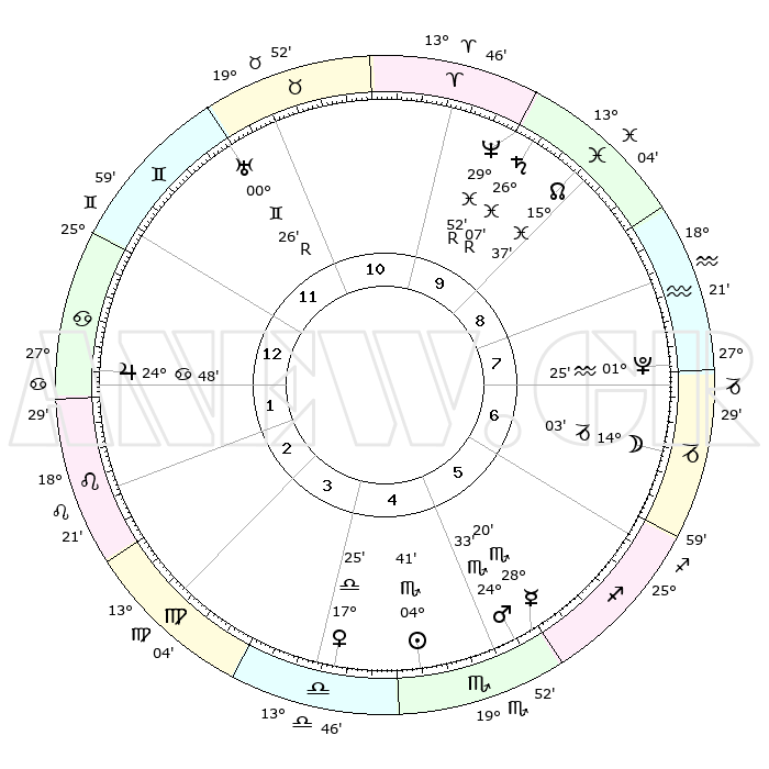 | | ΘΕΣΕΙΣ ΠΛΑΝΗΤΩΝ ΑΣΤΡΟΛΟΓΙΚΟΥ ΧΑΡΤΗ ΤΗΣ ΣΤΙΓΜΗΣ ΑΥΤΗΣ | | | | Πλανήτης | Ζώδιο | Μοίρες | Δεκαήμ. | Σε οίκο | Απόκλιση | | Ακμές των οίκων | | Ηλιος | Σκορπιός | 04°35' | Πρώτο | 5 | 13 S 03 | | 1ος | 22°60' | Δίδυμοι | | Σελήνη | Αιγόκερως | 12°43' | Δεύτερο | 7 | 27 S 26 | | 2ος | 14°20' | Καρκίνος | | Ερμής | Σκορπιός | 28°13' | Τρίτο | 6 | 22 S 28 | | 3ος | 05°46' | Λέων | | Αφροδίτη | Ζυγός | 17°17' | Δεύτερο | 5 | 05 S 23 | | 4ος | 01°02' | Παρθένος | | Αρης | Σκορπιός | 24°28' | Τρίτο | 6 | 19 S 13 | | 5ος | 03°46' | Ζυγός | | Δίας | Καρκίνος | 24°47' | Τρίτο | 2 | 21 N 14 | | 6ος | 14°03' | Σκορπιός | | Κρόνος | Ιχθείς | 26°08'R | Τρίτο | 10 | 03 S 49 | | 7ος | 22°60' | Τοξότης | | Ουρανός | Δίδυμοι | 00°26'R | Πρώτο | 12 | 20 N 02 | | 8ος | 14°20' | Αιγόκερως | | Ποσειδώνας | Ιχθείς | 29°53'R | Τρίτο | 10 | 01 S 18 | | 9ος | 05°46' | Υδροχόος | | Πλούτωνας | Υδροχόος | 01°25' | Πρώτο | 8 | 23 S 31 | | 10ος | 01°01' | Ιχθείς | | Β. Δεσμός | Ιχθείς | 15°37' | Δεύτερο | 10 | 05 S 40 | | 11ος | 03°46' | Κριός | | Ωροσκόπος | Δίδυμοι | 22°60' | Τρίτο | | | 12ος | 14°03' | Ταύρος | | Μεσουράνημα | Ιχθείς | 01°01' | Πρώτο | | | |