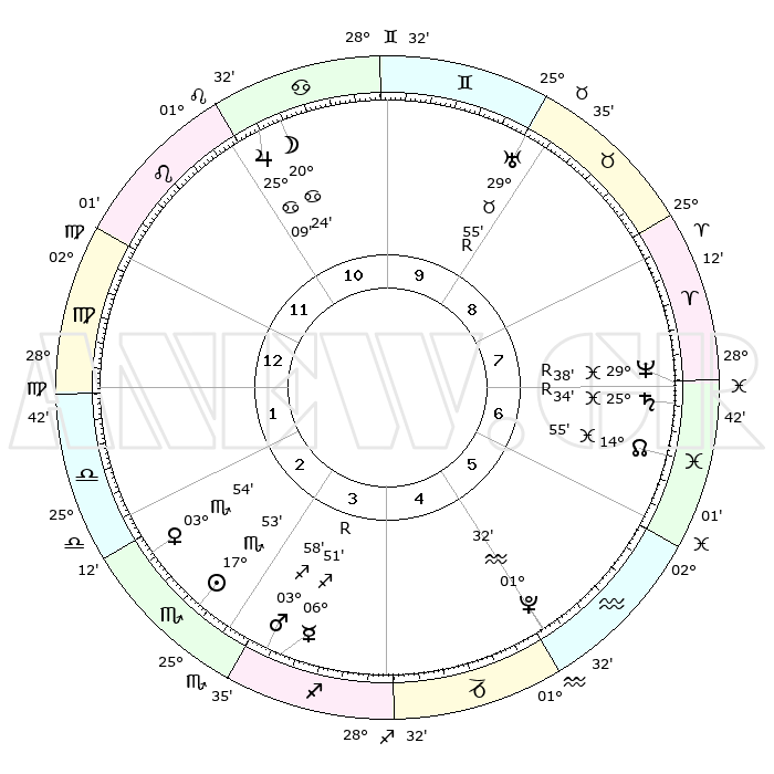 | | ΘΕΣΕΙΣ ΠΛΑΝΗΤΩΝ ΑΣΤΡΟΛΟΓΙΚΟΥ ΧΑΡΤΗ ΤΗΣ ΣΤΙΓΜΗΣ ΑΥΤΗΣ | | | | Πλανήτης | Ζώδιο | Μοίρες | Δεκαήμ. | Σε οίκο | Απόκλιση | | Ακμές των οίκων | | Ηλιος | Σκορπιός | 17°48' | Δεύτερο | 3 | 17 S 08 | | 1ος | 05°50' | Παρθένος | | Σελήνη | Καρκίνος | 19°18' | Δεύτερο | 11 | 26 N 16 | | 2ος | 00°18' | Ζυγός | | Ερμής | Τοξότης | 06°52'R | Πρώτο | 4 | 23 S 45 | | 3ος | 29°27' | Ζυγός | | Αφροδίτη | Σκορπιός | 03°48' | Πρώτο | 3 | 11 S 32 | | 4ος | 02°24' | Τοξότης | | Αρης | Τοξότης | 03°54' | Πρώτο | 4 | 21 S 24 | | 5ος | 06°14' | Αιγόκερως | | Δίας | Καρκίνος | 25°09' | Τρίτο | 11 | 21 N 12 | | 6ος | 07°46' | Υδροχόος | | Κρόνος | Ιχθείς | 25°35'R | Τρίτο | 7 | 04 S 00 | | 7ος | 05°50' | Ιχθείς | | Ουρανός | Ταύρος | 29°55'R | Τρίτο | 9 | 19 N 55 | | 8ος | 00°18' | Κριός | | Ποσειδώνας | Ιχθείς | 29°38'R | Τρίτο | 7 | 01 S 24 | | 9ος | 29°27' | Κριός | | Πλούτωνας | Υδροχόος | 01°32' | Πρώτο | 5 | 23 S 29 | | 10ος | 02°24' | Δίδυμοι | | Β. Δεσμός | Ιχθείς | 14°56' | Δεύτερο | 7 | 05 S 56 | | 11ος | 06°14' | Καρκίνος | | Ωροσκόπος | Παρθένος | 05°50' | Πρώτο | | | 12ος | 07°46' | Λέων | | Μεσουράνημα | Δίδυμοι | 02°24' | Πρώτο | | | |