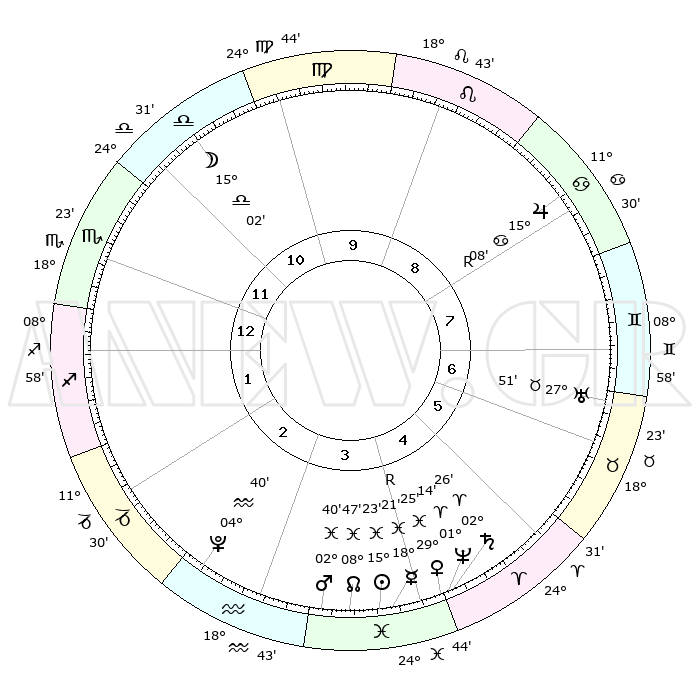 | | ΘΕΣΕΙΣ ΠΛΑΝΗΤΩΝ ΑΣΤΡΟΛΟΓΙΚΟΥ ΧΑΡΤΗ ΤΗΣ ΣΤΙΓΜΗΣ ΑΥΤΗΣ | | | | Πλανήτης | Ζώδιο | Μοίρες | Δεκαήμ. | Σε οίκο | Απόκλιση | | Ακμές των οίκων | | Ηλιος | Ιχθείς | 15°20' | Δεύτερο | 4 | 05 S 47 | | 1ος | 20°14' | Σκορπιός | | Σελήνη | Ζυγός | 14°14' | Δεύτερο | 11 | 08 S 25 | | 2ος | 20°13' | Τοξότης | | Ερμής | Ιχθείς | 18°24'R | Δεύτερο | 4 | 01 S 11 | | 3ος | 24°24' | Αιγόκερως | | Αφροδίτη | Ιχθείς | 29°20' | Τρίτο | 4 | 01 S 26 | | 4ος | 00°01' | Ιχθείς | | Αρης | Ιχθείς | 02°37' | Πρώτο | 4 | 11 S 34 | | 5ος | 02°04' | Κριός | | Δίας | Καρκίνος | 15°08'R | Δεύτερο | 8 | 22 N 55 | | 6ος | 28°26' | Κριός | | Κρόνος | Κριός | 02°26' | Πρώτο | 5 | 00 S 59 | | 7ος | 20°14' | Ταύρος | | Ουρανός | Ταύρος | 27°51' | Τρίτο | 7 | 19 N 30 | | 8ος | 20°13' | Δίδυμοι | | Ποσειδώνας | Κριός | 01°14' | Πρώτο | 4 | 00 S 43 | | 9ος | 24°24' | Καρκίνος | | Πλούτωνας | Υδροχόος | 04°40' | Πρώτο | 3 | 22 S 51 | | 10ος | 00°01' | Παρθένος | | Β. Δεσμός | Ιχθείς | 08°47' | Πρώτο | 4 | 08 S 16 | | 11ος | 02°04' | Ζυγός | | Ωροσκόπος | Σκορπιός | 20°14' | Τρίτο | | | 12ος | 28°26' | Ζυγός | | Μεσουράνημα | Παρθένος | 00°01' | Πρώτο | | | |