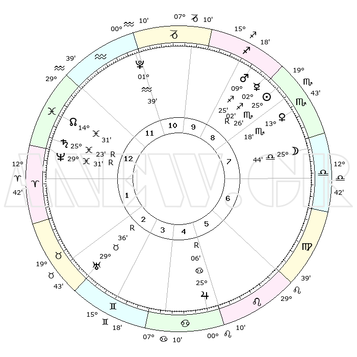 | | ΘΕΣΕΙΣ ΠΛΑΝΗΤΩΝ ΑΣΤΡΟΛΟΓΙΚΟΥ ΧΑΡΤΗ ΤΗΣ ΣΤΙΓΜΗΣ ΑΥΤΗΣ | | | | Πλανήτης | Ζώδιο | Μοίρες | Δεκαήμ. | Σε οίκο | Απόκλιση | | Ακμές των οίκων | | Ηλιος | Σκορπιός | 25°21' | Τρίτο | 9 | 19 S 06 | | 1ος | 25°05' | Υδροχόος | | Σελήνη | Ζυγός | 24°45' | Τρίτο | 8 | 12 S 31 | | 2ος | 10°48' | Κριός | | Ερμής | Τοξότης | 02°08'R | Πρώτο | 9 | 21 S 02 | | 3ος | 14°29' | Ταύρος | | Αφροδίτη | Σκορπιός | 13°12' | Δεύτερο | 8 | 14 S 43 | | 4ος | 09°24' | Δίδυμοι | | Αρης | Τοξότης | 09°21' | Πρώτο | 9 | 22 S 23 | | 5ος | 01°08' | Καρκίνος | | Δίας | Καρκίνος | 25°06'R | Τρίτο | 6 | 21 N 14 | | 6ος | 24°12' | Καρκίνος | | Κρόνος | Ιχθείς | 25°23'R | Τρίτο | 1 | 04 S 03 | | 7ος | 25°05' | Λέων | | Ουρανός | Ταύρος | 29°37'R | Τρίτο | 3 | 19 N 52 | | 8ος | 10°48' | Ζυγός | | Ποσειδώνας | Ιχθείς | 29°31'R | Τρίτο | 1 | 01 S 26 | | 9ος | 14°29' | Σκορπιός | | Πλούτωνας | Υδροχόος | 01°39' | Πρώτο | 12 | 23 S 28 | | 10ος | 09°24' | Τοξότης | | Β. Δεσμός | Ιχθείς | 14°32' | Δεύτερο | 1 | 06 S 05 | | 11ος | 01°08' | Αιγόκερως | | Ωροσκόπος | Υδροχόος | 25°05' | Τρίτο | | | 12ος | 24°12' | Αιγόκερως | | Μεσουράνημα | Τοξότης | 09°24' | Πρώτο | | | |