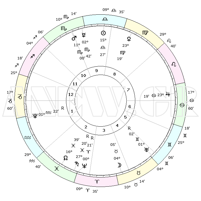 | ΘΕΣΕΙΣ ΠΛΑΝΗΤΩΝ ΑΣΤΡΟΛΟΓΙΚΟΥ ΧΑΡΤΗ ΤΗΣ ΣΤΙΓΜΗΣ ΑΥΤΗΣ | | Πλανήτης | Ζώδιο | Μοίρες | Δεκαήμ. | Σε οίκο | Απόκλιση | | Ακμές των οίκων | Ηλιος | Ζυγός | 15°23' | Δεύτερο | 10 | 06 S 03 | | 1ος | 20°13' | Τοξότης | Σελήνη | Ταύρος | 02°52' | Πρώτο | 4 | 15 N 55 | | 2ος | 25°01' | Αιγόκερως | Ερμής | Σκορπιός | 02°35' | Πρώτο | 10 | 13 S 17 | | 3ος | 03°60' | Ιχθείς | Αφροδίτη | Παρθένος | 23°13' | Τρίτο | 9 | 04 N 00 | | 4ος | 09°15' | Κριός | Αρης | Σκορπιός | 10°57' | Δεύτερο | 11 | 15 S 15 | | 5ος | 07°11' | Ταύρος | Δίας | Καρκίνος | 23°18' | Τρίτο | 7 | 21 N 27 | | 6ος | 29°47' | Ταύρος | Κρόνος | Ιχθείς | 27°20'R | Τρίτο | 3 | 03 S 22 | | 7ος | 20°13' | Δίδυμοι | Ουρανός | Δίδυμοι | 01°02'R | Πρώτο | 6 | 20 N 09 | | 8ος | 25°01' | Καρκίνος | Ποσειδώνας | Κριός | 00°21'R | Πρώτο | 3 | 01 S 07 | | 9ος | 03°60' | Παρθένος | Πλούτωνας | Υδροχόος | 01°22'R | Πρώτο | 2 | 23 S 32 | | 10ος | 09°15' | Ζυγός | Β. Δεσμός | Ιχθείς | 16°39' | Δεύτερο | 3 | 05 S 16 | | 11ος | 07°11' | Σκορπιός | Ωροσκόπος | Τοξότης | 20°13' | Τρίτο | | | 12ος | 29°47' | Σκορπιός | Μεσουράνημα | Ζυγός | 09°15' | Πρώτο | | | |