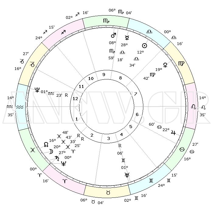 | ΘΕΣΕΙΣ ΠΛΑΝΗΤΩΝ ΑΣΤΡΟΛΟΓΙΚΟΥ ΧΑΡΤΗ ΤΗΣ ΣΤΙΓΜΗΣ ΑΥΤΗΣ | | Πλανήτης | Ζώδιο | Μοίρες | Δεκαήμ. | Σε οίκο | Απόκλιση | | Ακμές των οίκων | Ηλιος | Ζυγός | 12°28' | Δεύτερο | 9 | 04 S 56 | | 1ος | 05°14' | Αιγόκερως | Σελήνη | Ιχθείς | 19°19' | Δεύτερο | 2 | 04 S 08 | | 2ος | 13°44' | Υδροχόος | Ερμής | Ζυγός | 28°09' | Τρίτο | 10 | 11 S 24 | | 3ος | 23°59' | Ιχθείς | Αφροδίτη | Παρθένος | 19°35' | Δεύτερο | 8 | 05 N 24 | | 4ος | 27°02' | Κριός | Αρης | Σκορπιός | 08°55' | Πρώτο | 10 | 14 S 35 | | 5ος | 22°33' | Ταύρος | Δίας | Καρκίνος | 22°59' | Τρίτο | 7 | 21 N 30 | | 6ος | 14°04' | Δίδυμοι | Κρόνος | Ιχθείς | 27°33'R | Τρίτο | 3 | 03 S 17 | | 7ος | 05°14' | Καρκίνος | Ουρανός | Δίδυμοι | 01°06'R | Πρώτο | 5 | 20 N 10 | | 8ος | 13°43' | Λέων | Ποσειδώνας | Κριός | 00°26'R | Πρώτο | 3 | 01 S 06 | | 9ος | 23°59' | Παρθένος | Πλούτωνας | Υδροχόος | 01°23'R | Πρώτο | 1 | 23 S 32 | | 10ος | 27°02' | Ζυγός | Β. Δεσμός | Ιχθείς | 16°48' | Δεύτερο | 2 | 05 S 12 | | 11ος | 22°33' | Σκορπιός | Ωροσκόπος | Αιγόκερως | 05°14' | Πρώτο | | | 12ος | 14°04' | Τοξότης | Μεσουράνημα | Ζυγός | 27°02' | Τρίτο | | | |