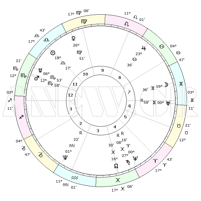 | ΘΕΣΕΙΣ ΠΛΑΝΗΤΩΝ ΑΣΤΡΟΛΟΓΙΚΟΥ ΧΑΡΤΗ ΤΗΣ ΣΤΙΓΜΗΣ ΑΥΤΗΣ | | Πλανήτης | Ζώδιο | Μοίρες | Δεκαήμ. | Σε οίκο | Απόκλιση | | Ακμές των οίκων | Ηλιος | Ζυγός | 18°05' | Δεύτερο | 1 | 07 S 06 | | 1ος | 07°31' | Ζυγός | Σελήνη | Δίδυμοι | 13°48' | Δεύτερο | 9 | 27 N 36 | | 2ος | 04°37' | Σκορπιός | Ερμής | Σκορπιός | 06°36' | Πρώτο | 2 | 14 S 57 | | 3ος | 05°20' | Τοξότης | Αφροδίτη | Παρθένος | 26°37' | Τρίτο | 12 | 02 N 42 | | 4ος | 08°27' | Αιγόκερως | Αρης | Σκορπιός | 12°50' | Δεύτερο | 2 | 15 S 52 | | 5ος | 11°23' | Υδροχόος | Δίας | Καρκίνος | 23°35' | Τρίτο | 10 | 21 N 25 | | 6ος | 11°31' | Ιχθείς | Κρόνος | Ιχθείς | 27°09'R | Τρίτο | 6 | 03 S 26 | | 7ος | 07°31' | Κριός | Ουρανός | Δίδυμοι | 00°58'R | Πρώτο | 8 | 20 N 08 | | 8ος | 04°37' | Ταύρος | Ποσειδώνας | Κριός | 00°17'R | Πρώτο | 6 | 01 S 09 | | 9ος | 05°20' | Δίδυμοι | Πλούτωνας | Υδροχόος | 01°22'R | Πρώτο | 4 | 23 S 32 | | 10ος | 08°27' | Καρκίνος | Β. Δεσμός | Ιχθείς | 16°30' | Δεύτερο | 6 | 05 S 20 | | 11ος | 11°23' | Λέων | Ωροσκόπος | Ζυγός | 07°31' | Πρώτο | | | 12ος | 11°31' | Παρθένος | Μεσουράνημα | Καρκίνος | 08°27' | Πρώτο | | | |