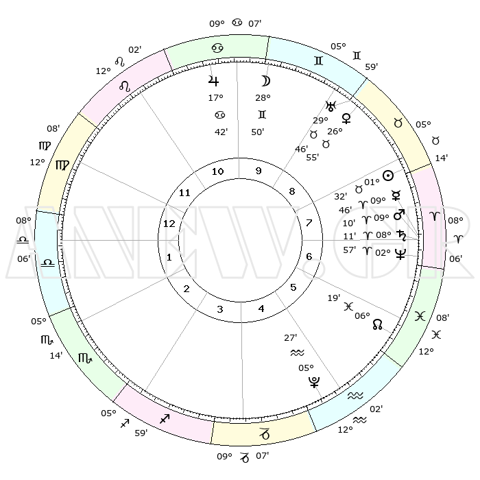 | | ΘΕΣΕΙΣ ΠΛΑΝΗΤΩΝ ΑΣΤΡΟΛΟΓΙΚΟΥ ΧΑΡΤΗ ΤΗΣ ΣΤΙΓΜΗΣ ΑΥΤΗΣ | | | | Πλανήτης | Ζώδιο | Μοίρες | Δεκαήμ. | Σε οίκο | Απόκλιση | | Ακμές των οίκων | | Ηλιος | Ταύρος | 01°28' | Πρώτο | 8 | 11 N 59 | | 1ος | 18°39' | Παρθένος | | Σελήνη | Δίδυμοι | 27°52' | Τρίτο | 10 | 28 N 12 | | 2ος | 14°20' | Ζυγός | | Ερμής | Κριός | 09°40' | Πρώτο | 7 | 01 N 27 | | 3ος | 14°17' | Σκορπιός | | Αφροδίτη | Ταύρος | 26°50' | Τρίτο | 9 | 19 N 54 | | 4ος | 17°12' | Τοξότης | | Αρης | Κριός | 09°07' | Πρώτο | 7 | 02 N 45 | | 5ος | 20°26' | Αιγόκερως | | Δίας | Καρκίνος | 17°42' | Δεύτερο | 10 | 22 N 39 | | 6ος | 21°19' | Υδροχόος | | Κρόνος | Κριός | 08°10' | Πρώτο | 7 | 01 N 16 | | 7ος | 18°39' | Ιχθείς | | Ουρανός | Ταύρος | 29°46' | Τρίτο | 9 | 19 N 56 | | 8ος | 14°20' | Κριός | | Ποσειδώνας | Κριός | 02°57' | Πρώτο | 7 | 00 S 02 | | 9ος | 14°16' | Ταύρος | | Πλούτωνας | Υδροχόος | 05°27' | Πρώτο | 5 | 22 S 48 | | 10ος | 17°12' | Δίδυμοι | | Β. Δεσμός | Ιχθείς | 06°19' | Πρώτο | 6 | 09 S 12 | | 11ος | 20°26' | Καρκίνος | | Ωροσκόπος | Παρθένος | 18°39' | Δεύτερο | | | 12ος | 21°19' | Λέων | | Μεσουράνημα | Δίδυμοι | 17°12' | Δεύτερο | | | |