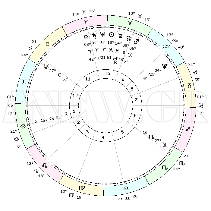 | | ΘΕΣΕΙΣ ΠΛΑΝΗΤΩΝ ΑΣΤΡΟΛΟΓΙΚΟΥ ΧΑΡΤΗ ΤΗΣ ΣΤΙΓΜΗΣ ΑΥΤΗΣ | | | | Πλανήτης | Ζώδιο | Μοίρες | Δεκαήμ. | Σε οίκο | Απόκλιση | | Ακμές των οίκων | | Ηλιος | Ιχθείς | 18°47' | Δεύτερο | 10 | 04 S 26 | | 1ος | 11°34' | Δίδυμοι | | Σελήνη | Σκορπιός | 26°36' | Τρίτο | 6 | 24 S 24 | | 2ος | 04°20' | Καρκίνος | | Ερμής | Ιχθείς | 14°57'R | Δεύτερο | 10 | 02 S 43 | | 3ος | 25°32' | Καρκίνος | | Αφροδίτη | Κριός | 03°38' | Πρώτο | 11 | 00 N 21 | | 4ος | 19°21' | Λέων | | Αρης | Ιχθείς | 05°21' | Πρώτο | 10 | 10 S 34 | | 5ος | 19°56' | Παρθένος | | Δίας | Καρκίνος | 15°05'R | Δεύτερο | 2 | 22 N 56 | | 6ος | 29°48' | Ζυγός | | Κρόνος | Κριός | 02°51' | Πρώτο | 11 | 00 S 49 | | 7ος | 11°34' | Τοξότης | | Ουρανός | Ταύρος | 27°57' | Τρίτο | 12 | 19 N 31 | | 8ος | 04°20' | Αιγόκερως | | Ποσειδώνας | Κριός | 01°21' | Πρώτο | 11 | 00 S 40 | | 9ος | 25°32' | Αιγόκερως | | Πλούτωνας | Υδροχόος | 04°45' | Πρώτο | 9 | 22 S 51 | | 10ος | 19°21' | Υδροχόος | | Β. Δεσμός | Ιχθείς | 08°36' | Πρώτο | 10 | 08 S 21 | | 11ος | 19°56' | Ιχθείς | | Ωροσκόπος | Δίδυμοι | 11°34' | Δεύτερο | | | 12ος | 29°48' | Κριός | | Μεσουράνημα | Υδροχόος | 19°21' | Δεύτερο | | | |
