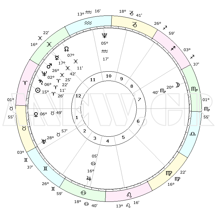 | | ΘΕΣΕΙΣ ΠΛΑΝΗΤΩΝ ΑΣΤΡΟΛΟΓΙΚΟΥ ΧΑΡΤΗ ΤΗΣ ΣΤΙΓΜΗΣ ΑΥΤΗΣ | | | | Πλανήτης | Ζώδιο | Μοίρες | Δεκαήμ. | Σε οίκο | Απόκλιση | | Ακμές των οίκων | | Ηλιος | Κριός | 15°12' | Δεύτερο | 3 | 05 N 59 | | 1ος | 04°26' | Αιγόκερως | | Σελήνη | Σκορπιός | 17°48' | Δεύτερο | 10 | 21 S 46 | | 2ος | 12°42' | Υδροχόος | | Ερμής | Ιχθείς | 17°27' | Δεύτερο | 2 | 06 S 40 | | 3ος | 22°56' | Ιχθείς | | Αφροδίτη | Ταύρος | 06°32' | Πρώτο | 4 | 13 N 26 | | 4ος | 26°08' | Κριός | | Αρης | Ιχθείς | 26°14' | Τρίτο | 3 | 02 S 27 | | 5ος | 21°46' | Ταύρος | | Δίας | Καρκίνος | 16°04' | Δεύτερο | 7 | 22 N 50 | | 6ος | 13°19' | Δίδυμοι | | Κρόνος | Κριός | 06°09' | Πρώτο | 3 | 00 N 29 | | 7ος | 04°26' | Καρκίνος | | Ουρανός | Ταύρος | 28°56' | Τρίτο | 5 | 19 N 45 | | 8ος | 12°42' | Λέων | | Ποσειδώνας | Κριός | 02°21' | Πρώτο | 3 | 00 S 16 | | 9ος | 22°56' | Παρθένος | | Πλούτωνας | Υδροχόος | 05°17' | Πρώτο | 1 | 22 S 47 | | 10ος | 26°08' | Ζυγός | | Β. Δεσμός | Ιχθείς | 07°12' | Πρώτο | 2 | 08 S 52 | | 11ος | 21°46' | Σκορπιός | | Ωροσκόπος | Αιγόκερως | 04°26' | Πρώτο | | | 12ος | 13°19' | Τοξότης | | Μεσουράνημα | Ζυγός | 26°08' | Τρίτο | | | |