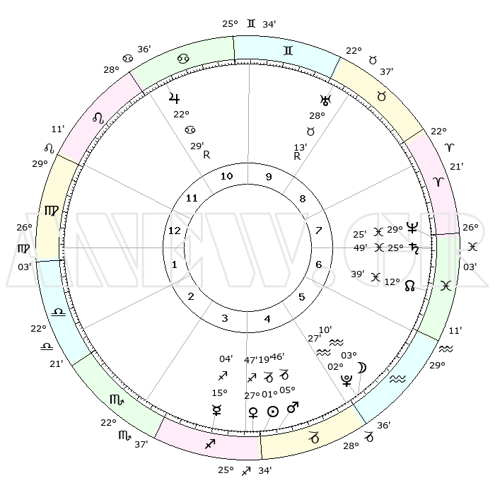 | | ΘΕΣΕΙΣ ΠΛΑΝΗΤΩΝ ΑΣΤΡΟΛΟΓΙΚΟΥ ΧΑΡΤΗ ΤΗΣ ΣΤΙΓΜΗΣ ΑΥΤΗΣ | | | | Πλανήτης | Ζώδιο | Μοίρες | Δεκαήμ. | Σε οίκο | Απόκλιση | | Ακμές των οίκων | | Ηλιος | Αιγόκερως | 01°14' | Πρώτο | 5 | 23 S 26 | | 1ος | 00°47' | Παρθένος | | Σελήνη | Υδροχόος | 02°06' | Πρώτο | 5 | 22 S 48 | | 2ος | 24°44' | Παρθένος | | Ερμής | Τοξότης | 14°57' | Δεύτερο | 4 | 22 S 03 | | 3ος | 23°28' | Ζυγός | | Αφροδίτη | Τοξότης | 27°41' | Τρίτο | 4 | 23 S 34 | | 4ος | 26°24' | Σκορπιός | | Αρης | Αιγόκερως | 05°42' | Πρώτο | 5 | 24 S 08 | | 5ος | 00°32' | Αιγόκερως | | Δίας | Καρκίνος | 22°30'R | Τρίτο | 11 | 21 N 46 | | 6ος | 02°25' | Υδροχόος | | Κρόνος | Ιχθείς | 25°49' | Τρίτο | 8 | 03 S 46 | | 7ος | 00°47' | Ιχθείς | | Ουρανός | Ταύρος | 28°13'R | Τρίτο | 10 | 19 N 34 | | 8ος | 24°44' | Ιχθείς | | Ποσειδώνας | Ιχθείς | 29°25' | Τρίτο | 8 | 01 S 28 | | 9ος | 23°28' | Κριός | | Πλούτωνας | Υδροχόος | 02°27' | Πρώτο | 6 | 23 S 17 | | 10ος | 26°24' | Ταύρος | | Β. Δεσμός | Ιχθείς | 12°39' | Δεύτερο | 7 | 06 S 49 | | 11ος | 00°32' | Καρκίνος | | Ωροσκόπος | Παρθένος | 00°47' | Πρώτο | | | 12ος | 02°25' | Λέων | | Μεσουράνημα | Ταύρος | 26°24' | Τρίτο | | | |