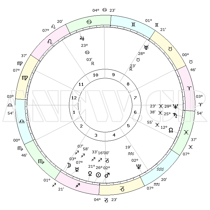 | | ΘΕΣΕΙΣ ΠΛΑΝΗΤΩΝ ΑΣΤΡΟΛΟΓΙΚΟΥ ΧΑΡΤΗ ΤΗΣ ΣΤΙΓΜΗΣ ΑΥΤΗΣ | | | | Πλανήτης | Ζώδιο | Μοίρες | Δεκαήμ. | Σε οίκο | Απόκλιση | | Ακμές των οίκων | | Ηλιος | Τοξότης | 26°11' | Τρίτο | 4 | 23 S 23 | | 1ος | 08°21' | Παρθένος | | Σελήνη | Τοξότης | 02°05' | Πρώτο | 3 | 25 S 24 | | 2ος | 03°04' | Ζυγός | | Ερμής | Τοξότης | 07°51' | Πρώτο | 4 | 20 S 27 | | 3ος | 02°25' | Σκορπιός | | Αφροδίτη | Τοξότης | 21°26' | Τρίτο | 4 | 23 S 06 | | 4ος | 05°22' | Τοξότης | | Αρης | Αιγόκερως | 01°56' | Πρώτο | 4 | 24 S 13 | | 5ος | 09°03' | Αιγόκερως | | Δίας | Καρκίνος | 23°04'R | Τρίτο | 11 | 21 N 40 | | 6ος | 10°26' | Υδροχόος | | Κρόνος | Ιχθείς | 25°38' | Τρίτο | 7 | 03 S 51 | | 7ος | 08°21' | Ιχθείς | | Ουρανός | Ταύρος | 28°24'R | Τρίτο | 9 | 19 N 36 | | 8ος | 03°04' | Κριός | | Ποσειδώνας | Ιχθείς | 29°23' | Τρίτο | 7 | 01 S 28 | | 9ος | 02°25' | Ταύρος | | Πλούτωνας | Υδροχόος | 02°19' | Πρώτο | 5 | 23 S 18 | | 10ος | 05°22' | Δίδυμοι | | Β. Δεσμός | Ιχθείς | 12°55' | Δεύτερο | 7 | 06 S 42 | | 11ος | 09°03' | Καρκίνος | | Ωροσκόπος | Παρθένος | 08°21' | Πρώτο | | | 12ος | 10°26' | Λέων | | Μεσουράνημα | Δίδυμοι | 05°22' | Πρώτο | | | |