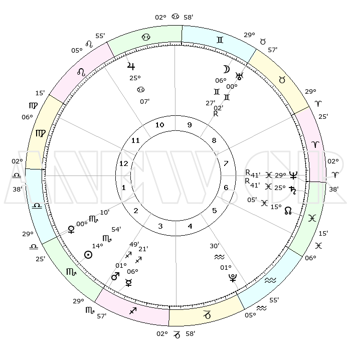| | ΘΕΣΕΙΣ ΠΛΑΝΗΤΩΝ ΑΣΤΡΟΛΟΓΙΚΟΥ ΧΑΡΤΗ ΤΗΣ ΣΤΙΓΜΗΣ ΑΥΤΗΣ | | | | Πλανήτης | Ζώδιο | Μοίρες | Δεκαήμ. | Σε οίκο | Απόκλιση | | Ακμές των οίκων | | Ηλιος | Σκορπιός | 14°49' | Δεύτερο | 3 | 16 S 17 | | 1ος | 11°34' | Παρθένος | | Σελήνη | Δίδυμοι | 05°21' | Πρώτο | 9 | 26 N 05 | | 2ος | 06°36' | Ζυγός | | Ερμής | Τοξότης | 06°20' | Πρώτο | 3 | 24 S 00 | | 3ος | 06°09' | Σκορπιός | | Αφροδίτη | Σκορπιός | 00°04' | Πρώτο | 2 | 10 S 12 | | 4ος | 09°06' | Τοξότης | | Αρης | Τοξότης | 01°46' | Πρώτο | 3 | 20 S 57 | | 5ος | 12°37' | Αιγόκερως | | Δίας | Καρκίνος | 25°07' | Τρίτο | 11 | 21 N 12 | | 6ος | 13°49' | Υδροχόος | | Κρόνος | Ιχθείς | 25°41'R | Τρίτο | 7 | 03 S 58 | | 7ος | 11°34' | Ιχθείς | | Ουρανός | Δίδυμοι | 00°02'R | Πρώτο | 9 | 19 N 57 | | 8ος | 06°36' | Κριός | | Ποσειδώνας | Ιχθείς | 29°41'R | Τρίτο | 7 | 01 S 23 | | 9ος | 06°09' | Ταύρος | | Πλούτωνας | Υδροχόος | 01°30' | Πρώτο | 5 | 23 S 30 | | 10ος | 09°06' | Δίδυμοι | | Β. Δεσμός | Ιχθείς | 15°05' | Δεύτερο | 7 | 05 S 53 | | 11ος | 12°37' | Καρκίνος | | Ωροσκόπος | Παρθένος | 11°34' | Δεύτερο | | | 12ος | 13°49' | Λέων | | Μεσουράνημα | Δίδυμοι | 09°06' | Πρώτο | | | |