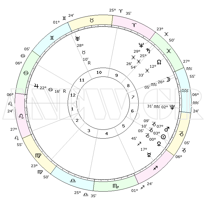 | | ΘΕΣΕΙΣ ΠΛΑΝΗΤΩΝ ΑΣΤΡΟΛΟΓΙΚΟΥ ΧΑΡΤΗ ΤΗΣ ΣΤΙΓΜΗΣ ΑΥΤΗΣ | | | | Πλανήτης | Ζώδιο | Μοίρες | Δεκαήμ. | Σε οίκο | Απόκλιση | | Ακμές των οίκων | | Ηλιος | Αιγόκερως | 03°06' | Πρώτο | 6 | 23 S 24 | | 1ος | 14°24' | Καρκίνος | | Σελήνη | Υδροχόος | 25°08' | Τρίτο | 8 | 14 S 28 | | 2ος | 04°50' | Λέων | | Ερμής | Τοξότης | 17°39' | Δεύτερο | 6 | 22 S 34 | | 3ος | 27°54' | Λέων | | Αφροδίτη | Τοξότης | 29°59' | Τρίτο | 6 | 23 S 39 | | 4ος | 26°37' | Παρθένος | | Αρης | Αιγόκερως | 07°06' | Πρώτο | 6 | 24 S 05 | | 5ος | 02°17' | Σκορπιός | | Δίας | Καρκίνος | 22°17'R | Τρίτο | 1 | 21 N 49 | | 6ος | 10°35' | Τοξότης | | Κρόνος | Ιχθείς | 25°54' | Τρίτο | 9 | 03 S 44 | | 7ος | 14°24' | Αιγόκερως | | Ουρανός | Ταύρος | 28°10'R | Τρίτο | 11 | 19 N 33 | | 8ος | 04°49' | Υδροχόος | | Ποσειδώνας | Ιχθείς | 29°26' | Τρίτο | 10 | 01 S 27 | | 9ος | 27°54' | Υδροχόος | | Πλούτωνας | Υδροχόος | 02°30' | Πρώτο | 7 | 23 S 16 | | 10ος | 26°37' | Ιχθείς | | Β. Δεσμός | Ιχθείς | 12°33' | Δεύτερο | 9 | 06 S 51 | | 11ος | 02°17' | Ταύρος | | Ωροσκόπος | Καρκίνος | 14°24' | Δεύτερο | | | 12ος | 10°35' | Δίδυμοι | | Μεσουράνημα | Ιχθείς | 26°37' | Τρίτο | | | |