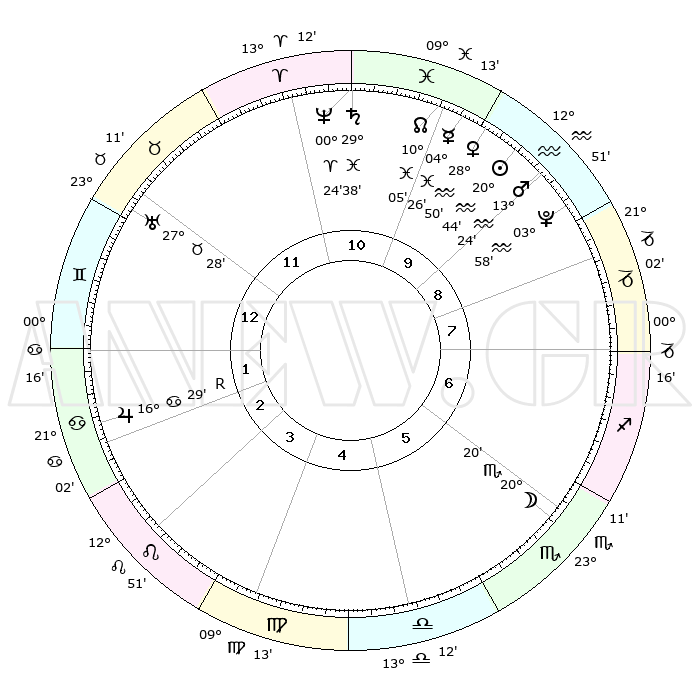 | | ΘΕΣΕΙΣ ΠΛΑΝΗΤΩΝ ΑΣΤΡΟΛΟΓΙΚΟΥ ΧΑΡΤΗ ΤΗΣ ΣΤΙΓΜΗΣ ΑΥΤΗΣ | | | | Πλανήτης | Ζώδιο | Μοίρες | Δεκαήμ. | Σε οίκο | Απόκλιση | | Ακμές των οίκων | | Ηλιος | Υδροχόος | 20°41' | Τρίτο | 10 | 14 S 36 | | 1ος | 09°08' | Δίδυμοι | | Σελήνη | Σκορπιός | 19°38' | Δεύτερο | 6 | 22 S 24 | | 2ος | 02°16' | Καρκίνος | | Ερμής | Ιχθείς | 04°20' | Πρώτο | 10 | 10 S 51 | | 3ος | 23°29' | Καρκίνος | | Αφροδίτη | Υδροχόος | 28°46' | Τρίτο | 10 | 13 S 16 | | 4ος | 17°02' | Λέων | | Αρης | Υδροχόος | 13°21' | Δεύτερο | 9 | 17 S 50 | | 5ος | 17°09' | Παρθένος | | Δίας | Καρκίνος | 16°30'R | Δεύτερο | 2 | 22 N 44 | | 6ος | 26°48' | Ζυγός | | Κρόνος | Ιχθείς | 29°37' | Τρίτο | 11 | 02 S 08 | | 7ος | 09°08' | Τοξότης | | Ουρανός | Ταύρος | 27°28' | Τρίτο | 12 | 19 N 25 | | 8ος | 02°16' | Αιγόκερως | | Ποσειδώνας | Κριός | 00°23' | Πρώτο | 11 | 01 S 03 | | 9ος | 23°29' | Αιγόκερως | | Πλούτωνας | Υδροχόος | 03°58' | Πρώτο | 9 | 22 S 58 | | 10ος | 17°02' | Υδροχόος | | Β. Δεσμός | Ιχθείς | 10°05' | Δεύτερο | 10 | 07 S 47 | | 11ος | 17°09' | Ιχθείς | | Ωροσκόπος | Δίδυμοι | 09°08' | Πρώτο | | | 12ος | 26°48' | Κριός | | Μεσουράνημα | Υδροχόος | 17°02' | Δεύτερο | | | |