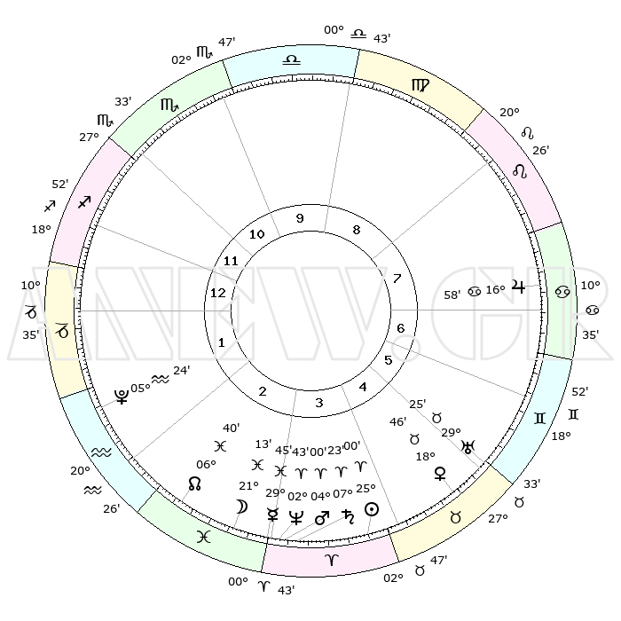 | | ΘΕΣΕΙΣ ΠΛΑΝΗΤΩΝ ΑΣΤΡΟΛΟΓΙΚΟΥ ΧΑΡΤΗ ΤΗΣ ΣΤΙΓΜΗΣ ΑΥΤΗΣ | | | | Πλανήτης | Ζώδιο | Μοίρες | Δεκαήμ. | Σε οίκο | Απόκλιση | | Ακμές των οίκων | | Ηλιος | Κριός | 24°57' | Τρίτο | 4 | 09 N 39 | | 1ος | 21°59' | Τοξότης | | Σελήνη | Ιχθείς | 20°27' | Τρίτο | 3 | 02 S 46 | | 2ος | 27°12' | Αιγόκερως | | Ερμής | Ιχθείς | 29°40' | Τρίτο | 3 | 02 S 30 | | 3ος | 06°24' | Ιχθείς | | Αφροδίτη | Ταύρος | 18°42' | Δεύτερο | 5 | 17 N 33 | | 4ος | 11°27' | Κριός | | Αρης | Κριός | 03°58' | Πρώτο | 3 | 00 N 40 | | 5ος | 09°05' | Ταύρος | | Δίας | Καρκίνος | 16°57' | Δεύτερο | 7 | 22 N 44 | | 6ος | 01°31' | Δίδυμοι | | Κρόνος | Κριός | 07°22' | Πρώτο | 3 | 00 N 57 | | 7ος | 21°59' | Δίδυμοι | | Ουρανός | Ταύρος | 29°25' | Τρίτο | 5 | 19 N 51 | | 8ος | 27°12' | Καρκίνος | | Ποσειδώνας | Κριός | 02°43' | Πρώτο | 3 | 00 S 07 | | 9ος | 06°24' | Παρθένος | | Πλούτωνας | Υδροχόος | 05°24' | Πρώτο | 2 | 22 S 47 | | 10ος | 11°27' | Ζυγός | | Β. Δεσμός | Ιχθείς | 06°40' | Πρώτο | 3 | 09 S 04 | | 11ος | 09°05' | Σκορπιός | | Ωροσκόπος | Τοξότης | 21°59' | Τρίτο | | | 12ος | 01°31' | Τοξότης | | Μεσουράνημα | Ζυγός | 11°27' | Δεύτερο | | | |
