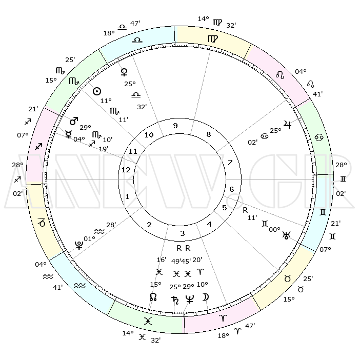 | | ΘΕΣΕΙΣ ΠΛΑΝΗΤΩΝ ΑΣΤΡΟΛΟΓΙΚΟΥ ΧΑΡΤΗ ΤΗΣ ΣΤΙΓΜΗΣ ΑΥΤΗΣ | | | | Πλανήτης | Ζώδιο | Μοίρες | Δεκαήμ. | Σε οίκο | Απόκλιση | | Ακμές των οίκων | | Ηλιος | Σκορπιός | 10°40' | Δεύτερο | 4 | 15 S 01 | | 1ος | 23°55' | Καρκίνος | | Σελήνη | Κριός | 02°41' | Πρώτο | 9 | 02 N 20 | | 2ος | 14°36' | Λέων | | Ερμής | Τοξότης | 03°56' | Πρώτο | 5 | 23 S 46 | | 3ος | 08°50' | Παρθένος | | Αφροδίτη | Ζυγός | 24°53' | Τρίτο | 4 | 08 S 17 | | 4ος | 09°03' | Ζυγός | | Αρης | Σκορπιός | 28°47' | Τρίτο | 5 | 20 S 17 | | 5ος | 15°08' | Σκορπιός | | Δίας | Καρκίνος | 25°01' | Τρίτο | 1 | 21 N 13 | | 6ος | 21°52' | Τοξότης | | Κρόνος | Ιχθείς | 25°51'R | Τρίτο | 9 | 03 S 55 | | 7ος | 23°55' | Αιγόκερως | | Ουρανός | Δίδυμοι | 00°12'R | Πρώτο | 11 | 19 N 59 | | 8ος | 14°36' | Υδροχόος | | Ποσειδώνας | Ιχθείς | 29°45'R | Τρίτο | 9 | 01 S 21 | | 9ος | 08°50' | Ιχθείς | | Πλούτωνας | Υδροχόος | 01°28' | Πρώτο | 7 | 23 S 30 | | 10ος | 09°03' | Κριός | | Β. Δεσμός | Ιχθείς | 15°18' | Δεύτερο | 9 | 05 S 47 | | 11ος | 15°08' | Ταύρος | | Ωροσκόπος | Καρκίνος | 23°55' | Τρίτο | | | 12ος | 21°52' | Δίδυμοι | | Μεσουράνημα | Κριός | 09°03' | Πρώτο | | | |
