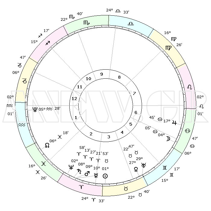 | | ΘΕΣΕΙΣ ΠΛΑΝΗΤΩΝ ΑΣΤΡΟΛΟΓΙΚΟΥ ΧΑΡΤΗ ΤΗΣ ΣΤΙΓΜΗΣ ΑΥΤΗΣ | | | | Πλανήτης | Ζώδιο | Μοίρες | Δεκαήμ. | Σε οίκο | Απόκλιση | | Ακμές των οίκων | | Ηλιος | Ταύρος | 01°49' | Πρώτο | 4 | 12 N 06 | | 1ος | 07°31' | Αιγόκερως | | Σελήνη | Καρκίνος | 03°10' | Πρώτο | 6 | 27 N 59 | | 2ος | 16°35' | Υδροχόος | | Ερμής | Κριός | 10°15' | Δεύτερο | 3 | 01 N 41 | | 3ος | 26°53' | Ιχθείς | | Αφροδίτη | Ταύρος | 27°17' | Τρίτο | 5 | 20 N 01 | | 4ος | 29°31' | Κριός | | Αρης | Κριός | 09°24' | Πρώτο | 3 | 02 N 51 | | 5ος | 24°43' | Ταύρος | | Δίας | Καρκίνος | 17°44' | Δεύτερο | 7 | 22 N 38 | | 6ος | 16°07' | Δίδυμοι | | Κρόνος | Κριός | 08°13' | Πρώτο | 3 | 01 N 17 | | 7ος | 07°31' | Καρκίνος | | Ουρανός | Ταύρος | 29°47' | Τρίτο | 5 | 19 N 56 | | 8ος | 16°35' | Λέων | | Ποσειδώνας | Κριός | 02°58' | Πρώτο | 3 | 00 S 02 | | 9ος | 26°53' | Παρθένος | | Πλούτωνας | Υδροχόος | 05°28' | Πρώτο | 1 | 22 S 48 | | 10ος | 29°31' | Ζυγός | | Β. Δεσμός | Ιχθείς | 06°18' | Πρώτο | 2 | 09 S 12 | | 11ος | 24°43' | Σκορπιός | | Ωροσκόπος | Αιγόκερως | 07°31' | Πρώτο | | | 12ος | 16°07' | Τοξότης | | Μεσουράνημα | Ζυγός | 29°31' | Τρίτο | | | |