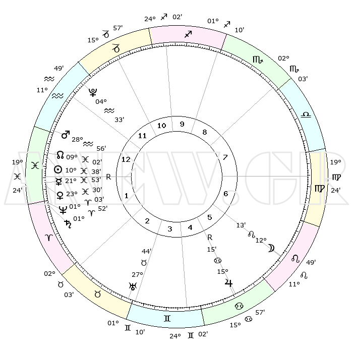 | | ΘΕΣΕΙΣ ΠΛΑΝΗΤΩΝ ΑΣΤΡΟΛΟΓΙΚΟΥ ΧΑΡΤΗ ΤΗΣ ΣΤΙΓΜΗΣ ΑΥΤΗΣ | | | | Πλανήτης | Ζώδιο | Μοίρες | Δεκαήμ. | Σε οίκο | Απόκλιση | | Ακμές των οίκων | | Ηλιος | Ιχθείς | 10°34' | Δεύτερο | 1 | 07 S 36 | | 1ος | 12°15' | Υδροχόος | | Σελήνη | Λέων | 11°16' | Δεύτερο | 6 | 19 N 46 | | 2ος | 27°48' | Ιχθείς | | Ερμής | Ιχθείς | 21°54'R | Τρίτο | 1 | 00 S 09 | | 3ος | 04°03' | Ταύρος | | Αφροδίτη | Ιχθείς | 23°25' | Τρίτο | 1 | 03 S 51 | | 4ος | 00°35' | Δίδυμοι | | Αρης | Υδροχόος | 28°53' | Τρίτο | 1 | 12 S 53 | | 5ος | 22°39' | Δίδυμοι | | Δίας | Καρκίνος | 15°15'R | Δεύτερο | 6 | 22 N 54 | | 6ος | 14°42' | Καρκίνος | | Κρόνος | Κριός | 01°51' | Πρώτο | 2 | 01 S 13 | | 7ος | 12°15' | Λέων | | Ουρανός | Ταύρος | 27°44' | Τρίτο | 3 | 19 N 29 | | 8ος | 27°48' | Παρθένος | | Ποσειδώνας | Κριός | 01°03' | Πρώτο | 2 | 00 S 47 | | 9ος | 04°03' | Σκορπιός | | Πλούτωνας | Υδροχόος | 04°32' | Πρώτο | 12 | 22 S 52 | | 10ος | 00°35' | Τοξότης | | Β. Δεσμός | Ιχθείς | 09°02' | Πρώτο | 1 | 08 S 11 | | 11ος | 22°39' | Τοξότης | | Ωροσκόπος | Υδροχόος | 12°15' | Δεύτερο | | | 12ος | 14°42' | Αιγόκερως | | Μεσουράνημα | Τοξότης | 00°35' | Πρώτο | | | |