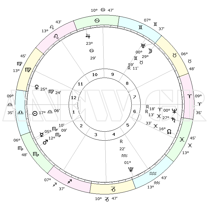| ΘΕΣΕΙΣ ΠΛΑΝΗΤΩΝ ΑΣΤΡΟΛΟΓΙΚΟΥ ΧΑΡΤΗ ΤΗΣ ΣΤΙΓΜΗΣ ΑΥΤΗΣ | | Πλανήτης | Ζώδιο | Μοίρες | Δεκαήμ. | Σε οίκο | Απόκλιση | | Ακμές των οίκων | Ηλιος | Ζυγός | 16°45' | Δεύτερο | 5 | 06 S 35 | | 1ος | 22°49' | Δίδυμοι | Σελήνη | Ταύρος | 23°51' | Τρίτο | 12 | 23 N 20 | | 2ος | 14°10' | Καρκίνος | Ερμής | Σκορπιός | 04°38' | Πρώτο | 5 | 14 S 09 | | 3ος | 05°35' | Λέων | Αφροδίτη | Παρθένος | 24°57' | Τρίτο | 4 | 03 N 20 | | 4ος | 00°49' | Παρθένος | Αρης | Σκορπιός | 11°55' | Δεύτερο | 5 | 15 S 34 | | 5ος | 03°31' | Ζυγός | Δίας | Καρκίνος | 23°27' | Τρίτο | 2 | 21 N 26 | | 6ος | 13°49' | Σκορπιός | Κρόνος | Ιχθείς | 27°15'R | Τρίτο | 10 | 03 S 24 | | 7ος | 22°49' | Τοξότης | Ουρανός | Δίδυμοι | 01°00'R | Πρώτο | 12 | 20 N 09 | | 8ος | 14°10' | Αιγόκερως | Ποσειδώνας | Κριός | 00°19'R | Πρώτο | 10 | 01 S 08 | | 9ος | 05°35' | Υδροχόος | Πλούτωνας | Υδροχόος | 01°22'R | Πρώτο | 8 | 23 S 32 | | 10ος | 00°49' | Ιχθείς | Β. Δεσμός | Ιχθείς | 16°34' | Δεύτερο | 10 | 05 S 18 | | 11ος | 03°31' | Κριός | Ωροσκόπος | Δίδυμοι | 22°49' | Τρίτο | | | 12ος | 13°49' | Ταύρος | Μεσουράνημα | Ιχθείς | 00°49' | Πρώτο | | | |