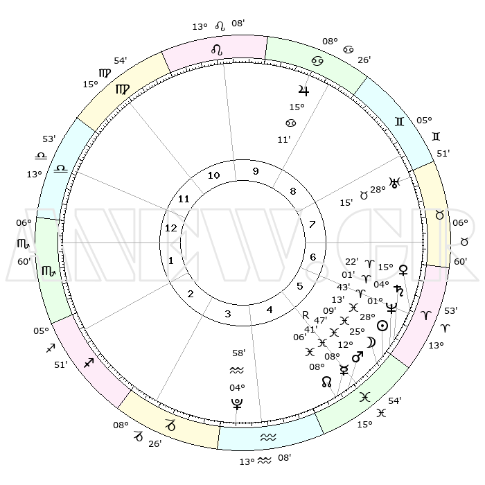 | | ΘΕΣΕΙΣ ΠΛΑΝΗΤΩΝ ΑΣΤΡΟΛΟΓΙΚΟΥ ΧΑΡΤΗ ΤΗΣ ΣΤΙΓΜΗΣ ΑΥΤΗΣ | | | | Πλανήτης | Ζώδιο | Μοίρες | Δεκαήμ. | Σε οίκο | Απόκλιση | | Ακμές των οίκων | | Ηλιος | Ιχθείς | 28°09' | Τρίτο | 6 | 00 S 44 | | 1ος | 15°56' | Ζυγός | | Σελήνη | Ιχθείς | 24°09' | Τρίτο | 6 | 01 S 03 | | 2ος | 13°32' | Σκορπιός | | Ερμής | Ιχθείς | 08°42'R | Πρώτο | 5 | 06 S 55 | | 3ος | 14°37' | Τοξότης | | Αφροδίτη | Κριός | 15°17' | Δεύτερο | 6 | 05 N 09 | | 4ος | 18°01' | Αιγόκερως | | Αρης | Ιχθείς | 12°44' | Δεύτερο | 5 | 07 S 47 | | 5ος | 20°58' | Υδροχόος | | Δίας | Καρκίνος | 15°11' | Δεύτερο | 9 | 22 N 56 | | 6ος | 20°40' | Ιχθείς | | Κρόνος | Κριός | 04°01' | Πρώτο | 6 | 00 S 21 | | 7ος | 15°56' | Κριός | | Ουρανός | Ταύρος | 28°14' | Τρίτο | 8 | 19 N 36 | | 8ος | 13°32' | Ταύρος | | Ποσειδώνας | Κριός | 01°42' | Πρώτο | 6 | 00 S 31 | | 9ος | 14°37' | Δίδυμοι | | Πλούτωνας | Υδροχόος | 04°58' | Πρώτο | 4 | 22 S 49 | | 10ος | 18°01' | Καρκίνος | | Β. Δεσμός | Ιχθείς | 08°06' | Πρώτο | 5 | 08 S 32 | | 11ος | 20°58' | Λέων | | Ωροσκόπος | Ζυγός | 15°56' | Δεύτερο | | | 12ος | 20°40' | Παρθένος | | Μεσουράνημα | Καρκίνος | 18°01' | Δεύτερο | | | |