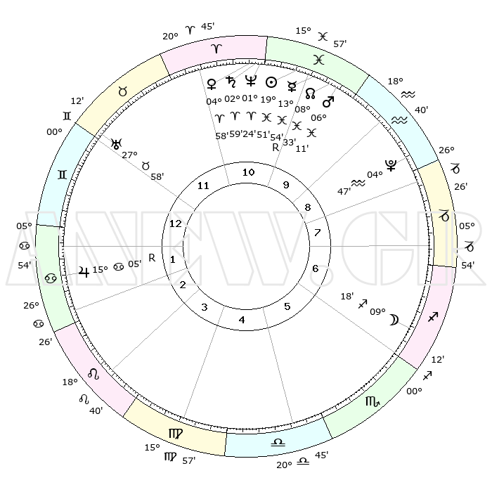| | ΘΕΣΕΙΣ ΠΛΑΝΗΤΩΝ ΑΣΤΡΟΛΟΓΙΚΟΥ ΧΑΡΤΗ ΤΗΣ ΣΤΙΓΜΗΣ ΑΥΤΗΣ | | | | Πλανήτης | Ζώδιο | Μοίρες | Δεκαήμ. | Σε οίκο | Απόκλιση | | Ακμές των οίκων | | Ηλιος | Ιχθείς | 19°47' | Δεύτερο | 10 | 04 S 03 | | 1ος | 12°37' | Δίδυμοι | | Σελήνη | Τοξότης | 08°30' | Πρώτο | 6 | 26 S 55 | | 2ος | 05°13' | Καρκίνος | | Ερμής | Ιχθείς | 13°58'R | Δεύτερο | 10 | 03 S 14 | | 3ος | 26°25' | Καρκίνος | | Αφροδίτη | Κριός | 04°53' | Πρώτο | 11 | 00 N 52 | | 4ος | 20°21' | Λέων | | Αρης | Ιχθείς | 06°08' | Πρώτο | 10 | 10 S 17 | | 5ος | 21°08' | Παρθένος | | Δίας | Καρκίνος | 15°05'R | Δεύτερο | 2 | 22 N 56 | | 6ος | 01°05' | Σκορπιός | | Κρόνος | Κριός | 02°58' | Πρώτο | 11 | 00 S 46 | | 7ος | 12°37' | Τοξότης | | Ουρανός | Ταύρος | 27°58' | Τρίτο | 12 | 19 N 32 | | 8ος | 05°13' | Αιγόκερως | | Ποσειδώνας | Κριός | 01°24' | Πρώτο | 11 | 00 S 39 | | 9ος | 26°25' | Αιγόκερως | | Πλούτωνας | Υδροχόος | 04°47' | Πρώτο | 9 | 22 S 50 | | 10ος | 20°21' | Υδροχόος | | Β. Δεσμός | Ιχθείς | 08°33' | Πρώτο | 10 | 08 S 22 | | 11ος | 21°08' | Ιχθείς | | Ωροσκόπος | Δίδυμοι | 12°37' | Δεύτερο | | | 12ος | 01°05' | Ταύρος | | Μεσουράνημα | Υδροχόος | 20°21' | Τρίτο | | | |