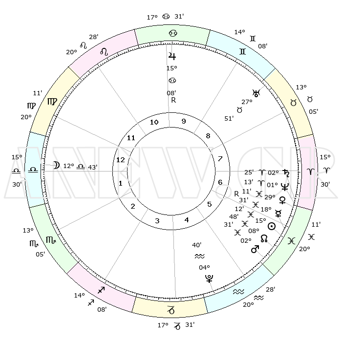 | | ΘΕΣΕΙΣ ΠΛΑΝΗΤΩΝ ΑΣΤΡΟΛΟΓΙΚΟΥ ΧΑΡΤΗ ΤΗΣ ΣΤΙΓΜΗΣ ΑΥΤΗΣ | | | | Πλανήτης | Ζώδιο | Μοίρες | Δεκαήμ. | Σε οίκο | Απόκλιση | | Ακμές των οίκων | | Ηλιος | Ιχθείς | 15°09' | Δεύτερο | 6 | 05 S 51 | | 1ος | 26°40' | Παρθένος | | Σελήνη | Ζυγός | 11°55' | Δεύτερο | 1 | 07 S 21 | | 2ος | 23°01' | Ζυγός | | Ερμής | Ιχθείς | 18°35'R | Δεύτερο | 6 | 01 S 07 | | 3ος | 23°19' | Σκορπιός | | Αφροδίτη | Ιχθείς | 29°06' | Τρίτο | 7 | 01 S 32 | | 4ος | 26°16' | Τοξότης | | Αρης | Ιχθείς | 02°28' | Πρώτο | 6 | 11 S 37 | | 5ος | 29°17' | Αιγόκερως | | Δίας | Καρκίνος | 15°08'R | Δεύτερο | 10 | 22 N 55 | | 6ος | 29°51' | Υδροχόος | | Κρόνος | Κριός | 02°24' | Πρώτο | 7 | 01 S 00 | | 7ος | 26°40' | Ιχθείς | | Ουρανός | Ταύρος | 27°51' | Τρίτο | 9 | 19 N 30 | | 8ος | 23°01' | Κριός | | Ποσειδώνας | Κριός | 01°13' | Πρώτο | 7 | 00 S 43 | | 9ος | 23°19' | Ταύρος | | Πλούτωνας | Υδροχόος | 04°40' | Πρώτο | 5 | 22 S 51 | | 10ος | 26°16' | Δίδυμοι | | Β. Δεσμός | Ιχθείς | 08°48' | Πρώτο | 6 | 08 S 16 | | 11ος | 29°17' | Καρκίνος | | Ωροσκόπος | Παρθένος | 26°40' | Τρίτο | | | 12ος | 29°51' | Λέων | | Μεσουράνημα | Δίδυμοι | 26°16' | Τρίτο | | | |