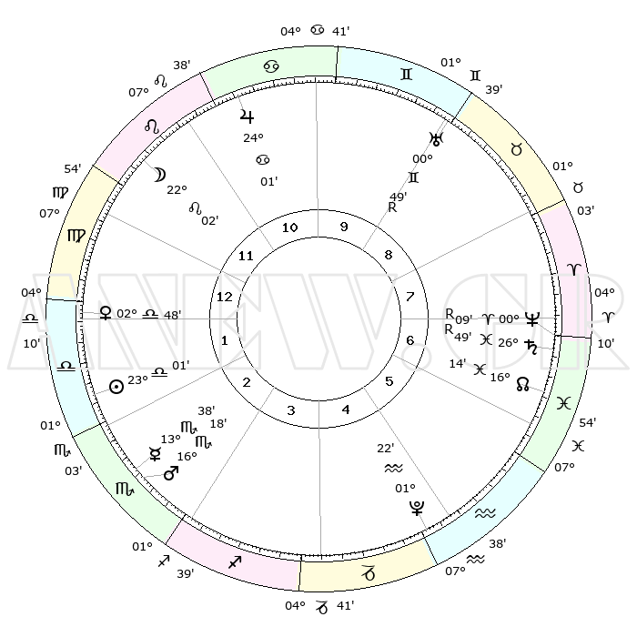 | ΘΕΣΕΙΣ ΠΛΑΝΗΤΩΝ ΑΣΤΡΟΛΟΓΙΚΟΥ ΧΑΡΤΗ ΤΗΣ ΣΤΙΓΜΗΣ ΑΥΤΗΣ | | Πλανήτης | Ζώδιο | Μοίρες | Δεκαήμ. | Σε οίκο | Απόκλιση | | Ακμές των οίκων | Ηλιος | Ζυγός | 22°53' | Τρίτο | 3 | 08 S 54 | | 1ος | 25°40' | Λέων | Σελήνη | Λέων | 20°20' | Τρίτο | 12 | 17 N 00 | | 2ος | 19°04' | Παρθένος | Ερμής | Σκορπιός | 13°27' | Δεύτερο | 3 | 17 S 37 | | 3ος | 17°19' | Ζυγός | Αφροδίτη | Ζυγός | 02°38' | Πρώτο | 2 | 00 N 21 | | 4ος | 20°10' | Σκορπιός | Αρης | Σκορπιός | 16°12' | Δεύτερο | 3 | 16 S 54 | | 5ος | 24°40' | Τοξότης | Δίας | Καρκίνος | 24°01' | Τρίτο | 11 | 21 N 21 | | 6ος | 26°59' | Αιγόκερως | Κρόνος | Ιχθείς | 26°49'R | Τρίτο | 8 | 03 S 33 | | 7ος | 25°40' | Υδροχόος | Ουρανός | Δίδυμοι | 00°50'R | Πρώτο | 10 | 20 N 07 | | 8ος | 19°04' | Ιχθείς | Ποσειδώνας | Κριός | 00°09'R | Πρώτο | 8 | 01 S 12 | | 9ος | 17°19' | Κριός | Πλούτωνας | Υδροχόος | 01°22' | Πρώτο | 6 | 23 S 32 | | 10ος | 20°10' | Ταύρος | Β. Δεσμός | Ιχθείς | 16°15' | Δεύτερο | 7 | 05 S 26 | | 11ος | 24°40' | Δίδυμοι | Ωροσκόπος | Λέων | 25°40' | Τρίτο | | | 12ος | 26°59' | Καρκίνος | Μεσουράνημα | Ταύρος | 20°10' | Τρίτο | | | |