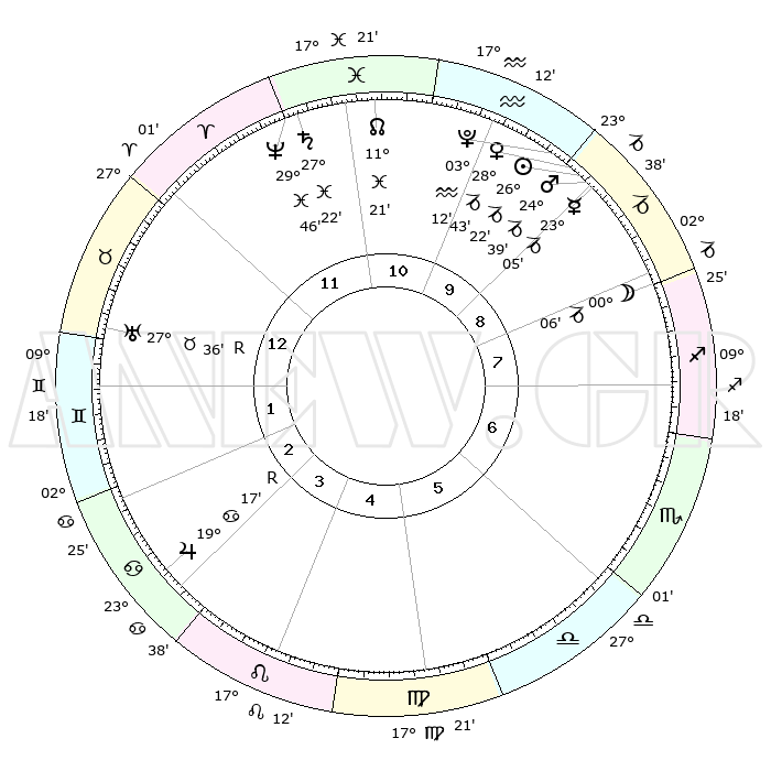 | | ΘΕΣΕΙΣ ΠΛΑΝΗΤΩΝ ΑΣΤΡΟΛΟΓΙΚΟΥ ΧΑΡΤΗ ΤΗΣ ΣΤΙΓΜΗΣ ΑΥΤΗΣ | | | | Πλανήτης | Ζώδιο | Μοίρες | Δεκαήμ. | Σε οίκο | Απόκλιση | | Ακμές των οίκων | | Ηλιος | Αιγόκερως | 26°18' | Τρίτο | 10 | 20 S 53 | | 1ος | 11°22' | Ταύρος | | Σελήνη | Τοξότης | 29°20' | Τρίτο | 8 | 28 S 16 | | 2ος | 10°32' | Δίδυμοι | | Ερμής | Αιγόκερως | 22°59' | Τρίτο | 9 | 23 S 19 | | 3ος | 03°03' | Καρκίνος | | Αφροδίτη | Αιγόκερως | 28°38' | Τρίτο | 10 | 21 S 26 | | 4ος | 24°54' | Καρκίνος | | Αρης | Αιγόκερως | 24°36' | Τρίτο | 9 | 22 S 09 | | 5ος | 20°35' | Λέων | | Δίας | Καρκίνος | 19°17'R | Δεύτερο | 3 | 22 N 19 | | 6ος | 25°34' | Παρθένος | | Κρόνος | Ιχθείς | 27°22' | Τρίτο | 12 | 03 S 05 | | 7ος | 11°22' | Σκορπιός | | Ουρανός | Ταύρος | 27°36'R | Τρίτο | 1 | 19 N 26 | | 8ος | 10°32' | Τοξότης | | Ποσειδώνας | Ιχθείς | 29°46' | Τρίτο | 12 | 01 S 18 | | 9ος | 03°03' | Αιγόκερως | | Πλούτωνας | Υδροχόος | 03°12' | Πρώτο | 10 | 23 S 07 | | 10ος | 24°54' | Αιγόκερως | | Β. Δεσμός | Ιχθείς | 11°21' | Δεύτερο | 11 | 07 S 18 | | 11ος | 20°35' | Υδροχόος | | Ωροσκόπος | Ταύρος | 11°22' | Δεύτερο | | | 12ος | 25°34' | Ιχθείς | | Μεσουράνημα | Αιγόκερως | 24°54' | Τρίτο | | | |