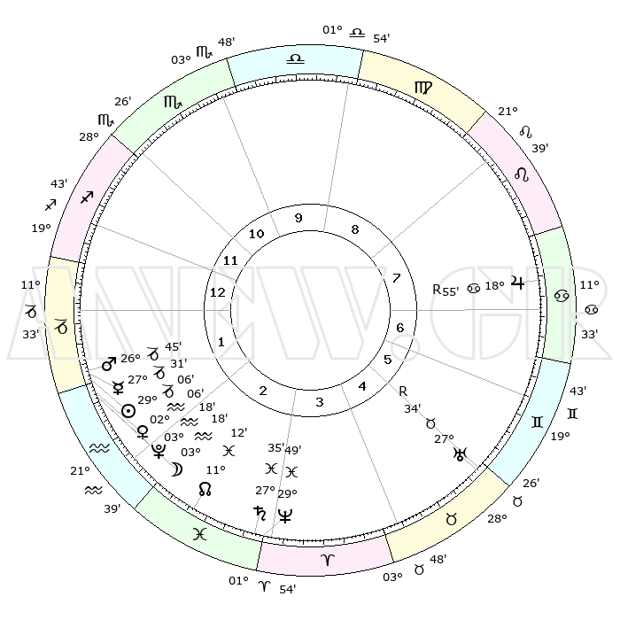 | | ΘΕΣΕΙΣ ΠΛΑΝΗΤΩΝ ΑΣΤΡΟΛΟΓΙΚΟΥ ΧΑΡΤΗ ΤΗΣ ΣΤΙΓΜΗΣ ΑΥΤΗΣ | | | | Πλανήτης | Ζώδιο | Μοίρες | Δεκαήμ. | Σε οίκο | Απόκλιση | | Ακμές των οίκων | | Ηλιος | Αιγόκερως | 29°02' | Τρίτο | 2 | 20 S 21 | | 1ος | 19°60' | Τοξότης | | Σελήνη | Υδροχόος | 02°29' | Πρώτο | 2 | 22 S 37 | | 2ος | 24°45' | Αιγόκερως | | Ερμής | Αιγόκερως | 27°24' | Τρίτο | 2 | 22 S 37 | | 3ος | 03°41' | Ιχθείς | | Αφροδίτη | Υδροχόος | 02°01' | Πρώτο | 2 | 20 S 46 | | 4ος | 08°58' | Κριός | | Αρης | Αιγόκερως | 26°42' | Τρίτο | 2 | 21 S 47 | | 5ος | 06°56' | Ταύρος | | Δίας | Καρκίνος | 18°56'R | Δεύτερο | 7 | 22 N 22 | | 6ος | 29°34' | Ταύρος | | Κρόνος | Ιχθείς | 27°35' | Τρίτο | 3 | 02 S 59 | | 7ος | 19°60' | Δίδυμοι | | Ουρανός | Ταύρος | 27°34'R | Τρίτο | 5 | 19 N 25 | | 8ος | 24°45' | Καρκίνος | | Ποσειδώνας | Ιχθείς | 29°49' | Τρίτο | 3 | 01 S 17 | | 9ος | 03°41' | Παρθένος | | Πλούτωνας | Υδροχόος | 03°17' | Πρώτο | 2 | 23 S 06 | | 10ος | 08°58' | Ζυγός | | Β. Δεσμός | Ιχθείς | 11°13' | Δεύτερο | 3 | 07 S 22 | | 11ος | 06°56' | Σκορπιός | | Ωροσκόπος | Τοξότης | 19°60' | Δεύτερο | | | 12ος | 29°34' | Σκορπιός | | Μεσουράνημα | Ζυγός | 08°58' | Πρώτο | | | |