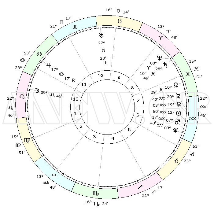 | | ΘΕΣΕΙΣ ΠΛΑΝΗΤΩΝ ΑΣΤΡΟΛΟΓΙΚΟΥ ΧΑΡΤΗ ΤΗΣ ΣΤΙΓΜΗΣ ΑΥΤΗΣ | | | | Πλανήτης | Ζώδιο | Μοίρες | Δεκαήμ. | Σε οίκο | Απόκλιση | | Ακμές των οίκων | | Ηλιος | Υδροχόος | 12°47' | Δεύτερο | 7 | 16 S 58 | | 1ος | 09°30' | Λέων | | Σελήνη | Λέων | 09°07' | Πρώτο | 12 | 20 N 29 | | 2ος | 01°17' | Παρθένος | | Ερμής | Υδροχόος | 20°38' | Τρίτο | 7 | 16 S 21 | | 3ος | 27°37' | Παρθένος | | Αφροδίτη | Υδροχόος | 18°60' | Δεύτερο | 7 | 16 S 26 | | 4ος | 29°38' | Ζυγός | | Αρης | Υδροχόος | 07°15' | Πρώτο | 6 | 19 S 28 | | 5ος | 05°16' | Τοξότης | | Δίας | Καρκίνος | 17°17'R | Δεύτερο | 12 | 22 N 37 | | 6ος | 09°30' | Αιγόκερως | | Κρόνος | Ιχθείς | 28°49' | Τρίτο | 9 | 02 S 28 | | 7ος | 09°30' | Υδροχόος | | Ουρανός | Ταύρος | 27°28'R | Τρίτο | 10 | 19 N 24 | | 8ος | 01°17' | Ιχθείς | | Ποσειδώνας | Κριός | 00°10' | Πρώτο | 9 | 01 S 09 | | 9ος | 27°37' | Ιχθείς | | Πλούτωνας | Υδροχόος | 03°43' | Πρώτο | 6 | 23 S 01 | | 10ος | 29°38' | Κριός | | Β. Δεσμός | Ιχθείς | 10°30' | Δεύτερο | 8 | 07 S 38 | | 11ος | 05°16' | Δίδυμοι | | Ωροσκόπος | Λέων | 09°30' | Πρώτο | | | 12ος | 09°30' | Καρκίνος | | Μεσουράνημα | Κριός | 29°38' | Τρίτο | | | |