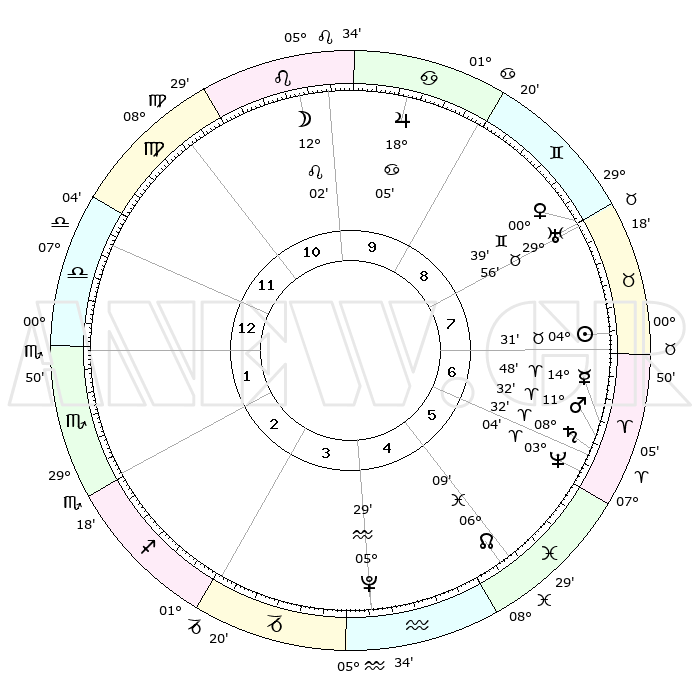| | ΘΕΣΕΙΣ ΠΛΑΝΗΤΩΝ ΑΣΤΡΟΛΟΓΙΚΟΥ ΧΑΡΤΗ ΤΗΣ ΣΤΙΓΜΗΣ ΑΥΤΗΣ | | | | Πλανήτης | Ζώδιο | Μοίρες | Δεκαήμ. | Σε οίκο | Απόκλιση | | Ακμές των οίκων | | Ηλιος | Ταύρος | 04°28' | Πρώτο | 7 | 13 N 00 | | 1ος | 15°49' | Ζυγός | | Σελήνη | Λέων | 11°20' | Δεύτερο | 10 | 19 N 31 | | 2ος | 13°25' | Σκορπιός | | Ερμής | Κριός | 14°43' | Δεύτερο | 6 | 03 N 32 | | 3ος | 14°30' | Τοξότης | | Αφροδίτη | Δίδυμοι | 00°35' | Πρώτο | 8 | 20 N 52 | | 4ος | 17°54' | Αιγόκερως | | Αρης | Κριός | 11°30' | Δεύτερο | 6 | 03 N 42 | | 5ος | 20°50' | Υδροχόος | | Δίας | Καρκίνος | 18°04' | Δεύτερο | 10 | 22 N 36 | | 6ος | 20°33' | Ιχθείς | | Κρόνος | Κριός | 08°32' | Πρώτο | 6 | 01 N 24 | | 7ος | 15°49' | Κριός | | Ουρανός | Ταύρος | 29°56' | Τρίτο | 8 | 19 N 58 | | 8ος | 13°25' | Ταύρος | | Ποσειδώνας | Κριός | 03°03' | Πρώτο | 6 | 00 N 00 | | 9ος | 14°30' | Δίδυμοι | | Πλούτωνας | Υδροχόος | 05°29' | Πρώτο | 4 | 22 S 48 | | 10ος | 17°54' | Καρκίνος | | Β. Δεσμός | Ιχθείς | 06°09' | Πρώτο | 5 | 09 S 15 | | 11ος | 20°50' | Λέων | | Ωροσκόπος | Ζυγός | 15°49' | Δεύτερο | | | 12ος | 20°33' | Παρθένος | | Μεσουράνημα | Καρκίνος | 17°54' | Δεύτερο | | | |