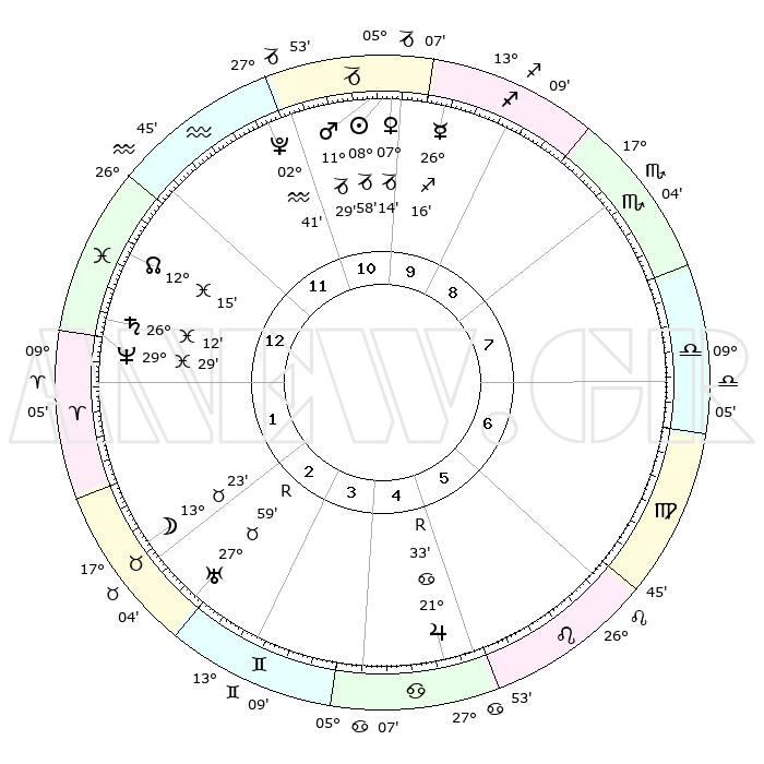 | | ΘΕΣΕΙΣ ΠΛΑΝΗΤΩΝ ΑΣΤΡΟΛΟΓΙΚΟΥ ΧΑΡΤΗ ΤΗΣ ΣΤΙΓΜΗΣ ΑΥΤΗΣ | | | | Πλανήτης | Ζώδιο | Μοίρες | Δεκαήμ. | Σε οίκο | Απόκλιση | | Ακμές των οίκων | | Ηλιος | Αιγόκερως | 08°53' | Πρώτο | 11 | 23 S 08 | | 1ος | 26°56' | Υδροχόος | | Σελήνη | Ταύρος | 12°18' | Δεύτερο | 2 | 19 N 45 | | 2ος | 12°33' | Κριός | | Ερμής | Τοξότης | 26°09' | Τρίτο | 10 | 23 S 46 | | 3ος | 15°53' | Ταύρος | | Αφροδίτη | Αιγόκερως | 07°09' | Πρώτο | 11 | 23 S 41 | | 4ος | 10°36' | Δίδυμοι | | Αρης | Αιγόκερως | 11°26' | Δεύτερο | 11 | 23 S 49 | | 5ος | 02°18' | Καρκίνος | | Δίας | Καρκίνος | 21°34'R | Τρίτο | 5 | 21 N 56 | | 6ος | 25°33' | Καρκίνος | | Κρόνος | Ιχθείς | 26°12' | Τρίτο | 1 | 03 S 36 | | 7ος | 26°56' | Λέων | | Ουρανός | Ταύρος | 27°59'R | Τρίτο | 3 | 19 N 31 | | 8ος | 12°33' | Ζυγός | | Ποσειδώνας | Ιχθείς | 29°29' | Τρίτο | 1 | 01 S 26 | | 9ος | 15°53' | Σκορπιός | | Πλούτωνας | Υδροχόος | 02°40' | Πρώτο | 12 | 23 S 14 | | 10ος | 10°36' | Τοξότης | | Β. Δεσμός | Ιχθείς | 12°15' | Δεύτερο | 1 | 06 S 58 | | 11ος | 02°18' | Αιγόκερως | | Ωροσκόπος | Υδροχόος | 26°56' | Τρίτο | | | 12ος | 25°33' | Αιγόκερως | | Μεσουράνημα | Τοξότης | 10°36' | Δεύτερο | | | |