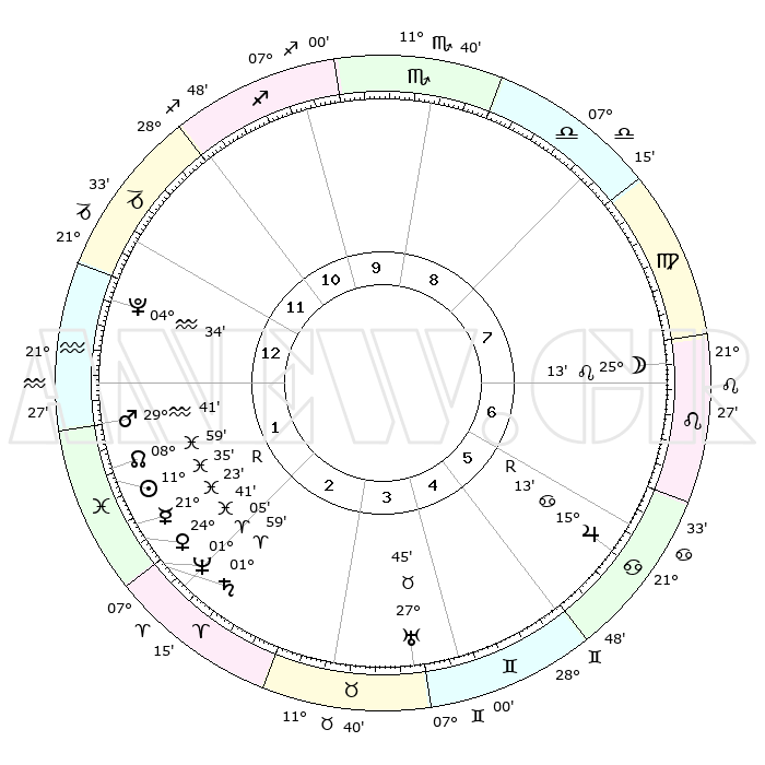 | | ΘΕΣΕΙΣ ΠΛΑΝΗΤΩΝ ΑΣΤΡΟΛΟΓΙΚΟΥ ΧΑΡΤΗ ΤΗΣ ΣΤΙΓΜΗΣ ΑΥΤΗΣ | | | | Πλανήτης | Ζώδιο | Μοίρες | Δεκαήμ. | Σε οίκο | Απόκλιση | | Ακμές των οίκων | | Ηλιος | Ιχθείς | 11°27' | Δεύτερο | 2 | 07 S 16 | | 1ος | 26°53' | Τοξότης | | Σελήνη | Λέων | 23°21' | Τρίτο | 8 | 15 N 05 | | 2ος | 03°15' | Υδροχόος | | Ερμής | Ιχθείς | 21°27'R | Τρίτο | 3 | 00 S 13 | | 3ος | 12°59' | Ιχθείς | | Αφροδίτη | Ιχθείς | 24°31' | Τρίτο | 3 | 03 S 25 | | 4ος | 17°24' | Κριός | | Αρης | Υδροχόος | 29°34' | Τρίτο | 2 | 12 S 39 | | 5ος | 14°14' | Ταύρος | | Δίας | Καρκίνος | 15°13'R | Δεύτερο | 7 | 22 N 54 | | 6ος | 06°15' | Δίδυμοι | | Κρόνος | Κριός | 01°58' | Πρώτο | 3 | 01 S 11 | | 7ος | 26°53' | Δίδυμοι | | Ουρανός | Ταύρος | 27°45' | Τρίτο | 5 | 19 N 29 | | 8ος | 03°15' | Λέων | | Ποσειδώνας | Κριός | 01°05' | Πρώτο | 3 | 00 S 46 | | 9ος | 12°59' | Παρθένος | | Πλούτωνας | Υδροχόος | 04°34' | Πρώτο | 2 | 22 S 52 | | 10ος | 17°24' | Ζυγός | | Β. Δεσμός | Ιχθείς | 08°59' | Πρώτο | 2 | 08 S 12 | | 11ος | 14°13' | Σκορπιός | | Ωροσκόπος | Τοξότης | 26°53' | Τρίτο | | | 12ος | 06°15' | Τοξότης | | Μεσουράνημα | Ζυγός | 17°24' | Δεύτερο | | | |
