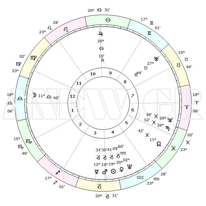 | | ΘΕΣΕΙΣ ΠΛΑΝΗΤΩΝ ΑΣΤΡΟΛΟΓΙΚΟΥ ΧΑΡΤΗ ΤΗΣ ΣΤΙΓΜΗΣ ΑΥΤΗΣ | | | | Πλανήτης | Ζώδιο | Μοίρες | Δεκαήμ. | Σε οίκο | Απόκλιση | | Ακμές των οίκων | | Ηλιος | Αιγόκερως | 19°02' | Δεύτερο | 11 | 22 S 05 | | 1ος | 20°14' | Υδροχόος | | Σελήνη | Ζυγός | 03°51' | Πρώτο | 7 | 03 S 25 | | 2ος | 06°02' | Κριός | | Ερμής | Αιγόκερως | 11°33' | Δεύτερο | 11 | 24 S 18 | | 3ος | 10°43' | Ταύρος | | Αφροδίτη | Αιγόκερως | 19°40' | Δεύτερο | 11 | 22 S 47 | | 4ος | 06°11' | Δίδυμοι | | Αρης | Αιγόκερως | 19°05' | Δεύτερο | 11 | 23 S 00 | | 5ος | 28°00' | Δίδυμοι | | Δίας | Καρκίνος | 20°15'R | Τρίτο | 5 | 22 N 10 | | 6ος | 20°39' | Καρκίνος | | Κρόνος | Ιχθείς | 26°49' | Τρίτο | 1 | 03 S 19 | | 7ος | 20°14' | Λέων | | Ουρανός | Ταύρος | 27°44'R | Τρίτο | 3 | 19 N 28 | | 8ος | 06°02' | Ζυγός | | Ποσειδώνας | Ιχθείς | 29°38' | Τρίτο | 1 | 01 S 22 | | 9ος | 10°43' | Σκορπιός | | Πλούτωνας | Υδροχόος | 02°59' | Πρώτο | 12 | 23 S 10 | | 10ος | 06°11' | Τοξότης | | Β. Δεσμός | Ιχθείς | 11°44' | Δεύτερο | 1 | 07 S 10 | | 11ος | 28°00' | Τοξότης | | Ωροσκόπος | Υδροχόος | 20°14' | Τρίτο | | | 12ος | 20°39' | Αιγόκερως | | Μεσουράνημα | Τοξότης | 06°11' | Πρώτο | | | |