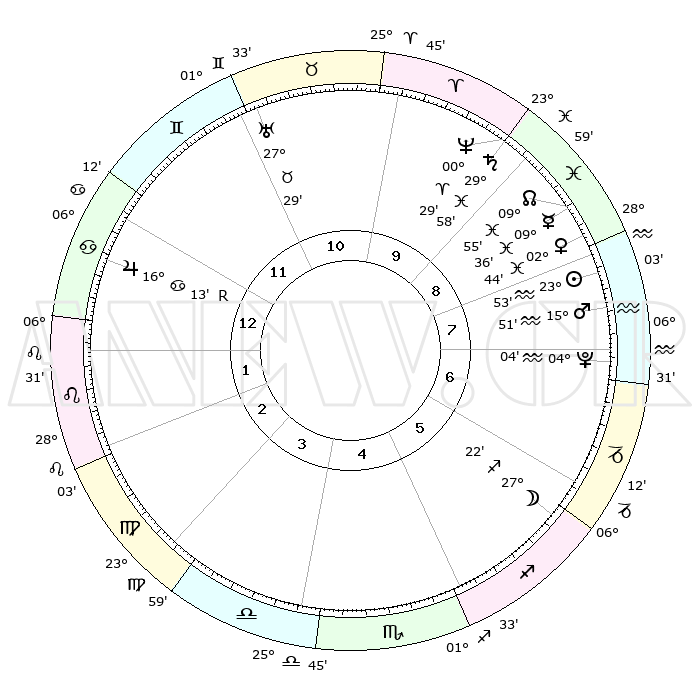 | | ΘΕΣΕΙΣ ΠΛΑΝΗΤΩΝ ΑΣΤΡΟΛΟΓΙΚΟΥ ΧΑΡΤΗ ΤΗΣ ΣΤΙΓΜΗΣ ΑΥΤΗΣ | | | | Πλανήτης | Ζώδιο | Μοίρες | Δεκαήμ. | Σε οίκο | Απόκλιση | | Ακμές των οίκων | | Ηλιος | Υδροχόος | 23°49' | Τρίτο | 8 | 13 S 35 | | 1ος | 16°13' | Καρκίνος | | Σελήνη | Τοξότης | 26°32' | Τρίτο | 6 | 28 S 24 | | 2ος | 06°40' | Λέων | | Ερμής | Ιχθείς | 09°29' | Πρώτο | 9 | 08 S 26 | | 3ος | 29°57' | Λέων | | Αφροδίτη | Ιχθείς | 02°39' | Πρώτο | 9 | 11 S 54 | | 4ος | 28°58' | Παρθένος | | Αρης | Υδροχόος | 15°47' | Δεύτερο | 8 | 17 S 08 | | 5ος | 04°46' | Σκορπιός | | Δίας | Καρκίνος | 16°13'R | Δεύτερο | 1 | 22 N 46 | | 6ος | 12°46' | Τοξότης | | Κρόνος | Ιχθείς | 29°57' | Τρίτο | 10 | 02 S 00 | | 7ος | 16°13' | Αιγόκερως | | Ουρανός | Ταύρος | 27°29' | Τρίτο | 11 | 19 N 25 | | 8ος | 06°40' | Υδροχόος | | Ποσειδώνας | Κριός | 00°29' | Πρώτο | 10 | 01 S 01 | | 9ος | 29°57' | Υδροχόος | | Πλούτωνας | Υδροχόος | 04°04' | Πρώτο | 7 | 22 S 57 | | 10ος | 28°58' | Ιχθείς | | Β. Δεσμός | Ιχθείς | 09°55' | Πρώτο | 9 | 07 S 51 | | 11ος | 04°46' | Ταύρος | | Ωροσκόπος | Καρκίνος | 16°13' | Δεύτερο | | | 12ος | 12°46' | Δίδυμοι | | Μεσουράνημα | Ιχθείς | 28°58' | Τρίτο | | | |