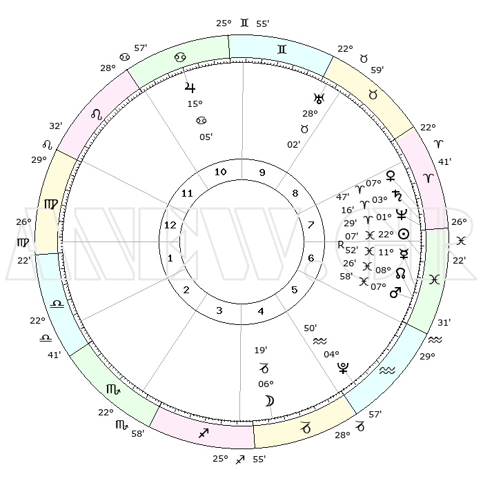 | | ΘΕΣΕΙΣ ΠΛΑΝΗΤΩΝ ΑΣΤΡΟΛΟΓΙΚΟΥ ΧΑΡΤΗ ΤΗΣ ΣΤΙΓΜΗΣ ΑΥΤΗΣ | | | | Πλανήτης | Ζώδιο | Μοίρες | Δεκαήμ. | Σε οίκο | Απόκλιση | | Ακμές των οίκων | | Ηλιος | Ιχθείς | 22°04' | Τρίτο | 7 | 03 S 09 | | 1ος | 08°24' | Παρθένος | | Σελήνη | Αιγόκερως | 05°35' | Πρώτο | 4 | 28 S 02 | | 2ος | 03°07' | Ζυγός | | Ερμής | Ιχθείς | 11°55'R | Δεύτερο | 7 | 04 S 23 | | 3ος | 02°28' | Σκορπιός | | Αφροδίτη | Κριός | 07°42' | Πρώτο | 8 | 02 N 02 | | 4ος | 05°25' | Τοξότης | | Αρης | Ιχθείς | 07°55' | Πρώτο | 6 | 09 S 36 | | 5ος | 09°05' | Αιγόκερως | | Δίας | Καρκίνος | 15°05' | Δεύτερο | 11 | 22 N 56 | | 6ος | 10°28' | Υδροχόος | | Κρόνος | Κριός | 03°15' | Πρώτο | 8 | 00 S 39 | | 7ος | 08°24' | Ιχθείς | | Ουρανός | Ταύρος | 28°02' | Τρίτο | 9 | 19 N 33 | | 8ος | 03°07' | Κριός | | Ποσειδώνας | Κριός | 01°29' | Πρώτο | 7 | 00 S 37 | | 9ος | 02°28' | Ταύρος | | Πλούτωνας | Υδροχόος | 04°50' | Πρώτο | 5 | 22 S 50 | | 10ος | 05°25' | Δίδυμοι | | Β. Δεσμός | Ιχθείς | 08°26' | Πρώτο | 7 | 08 S 24 | | 11ος | 09°05' | Καρκίνος | | Ωροσκόπος | Παρθένος | 08°24' | Πρώτο | | | 12ος | 10°28' | Λέων | | Μεσουράνημα | Δίδυμοι | 05°25' | Πρώτο | | | |