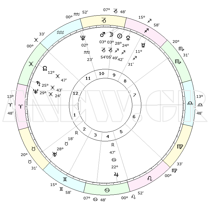 | | ΘΕΣΕΙΣ ΠΛΑΝΗΤΩΝ ΑΣΤΡΟΛΟΓΙΚΟΥ ΧΑΡΤΗ ΤΗΣ ΣΤΙΓΜΗΣ ΑΥΤΗΣ | | | | Πλανήτης | Ζώδιο | Μοίρες | Δεκαήμ. | Σε οίκο | Απόκλιση | | Ακμές των οίκων | | Ηλιος | Τοξότης | 28°45' | Τρίτο | 10 | 23 S 26 | | 1ος | 03°10' | Ιχθείς | | Σελήνη | Αιγόκερως | 02°15' | Πρώτο | 10 | 28 S 06 | | 2ος | 18°18' | Κριός | | Ερμής | Τοξότης | 11°25' | Δεύτερο | 9 | 21 S 18 | | 3ος | 20°24' | Ταύρος | | Αφροδίτη | Τοξότης | 24°36' | Τρίτο | 10 | 23 S 23 | | 4ος | 14°30' | Δίδυμοι | | Αρης | Αιγόκερως | 03°51' | Πρώτο | 10 | 24 S 11 | | 5ος | 06°11' | Καρκίνος | | Δίας | Καρκίνος | 22°47'R | Τρίτο | 5 | 21 N 43 | | 6ος | 00°04' | Λέων | | Κρόνος | Ιχθείς | 25°43' | Τρίτο | 1 | 03 S 49 | | 7ος | 03°10' | Παρθένος | | Ουρανός | Ταύρος | 28°18'R | Τρίτο | 3 | 19 N 35 | | 8ος | 18°18' | Ζυγός | | Ποσειδώνας | Ιχθείς | 29°24' | Τρίτο | 1 | 01 S 28 | | 9ος | 20°24' | Σκορπιός | | Πλούτωνας | Υδροχόος | 02°23' | Πρώτο | 12 | 23 S 17 | | 10ος | 14°30' | Τοξότης | | Β. Δεσμός | Ιχθείς | 12°47' | Δεύτερο | 1 | 06 S 46 | | 11ος | 06°11' | Αιγόκερως | | Ωροσκόπος | Ιχθείς | 03°10' | Πρώτο | | | 12ος | 00°04' | Υδροχόος | | Μεσουράνημα | Τοξότης | 14°30' | Δεύτερο | | | |