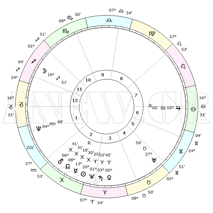| | ΘΕΣΕΙΣ ΠΛΑΝΗΤΩΝ ΑΣΤΡΟΛΟΓΙΚΟΥ ΧΑΡΤΗ ΤΗΣ ΣΤΙΓΜΗΣ ΑΥΤΗΣ | | | | Πλανήτης | Ζώδιο | Μοίρες | Δεκαήμ. | Σε οίκο | Απόκλιση | | Ακμές των οίκων | | Ηλιος | Ιχθείς | 20°26' | Τρίτο | 3 | 03 S 47 | | 1ος | 26°31' | Τοξότης | | Σελήνη | Τοξότης | 16°10' | Δεύτερο | 12 | 27 S 55 | | 2ος | 02°48' | Υδροχόος | | Ερμής | Ιχθείς | 13°21'R | Δεύτερο | 3 | 03 S 33 | | 3ος | 12°30' | Ιχθείς | | Αφροδίτη | Κριός | 05°41' | Πρώτο | 3 | 01 N 12 | | 4ος | 16°58' | Κριός | | Αρης | Ιχθείς | 06°38' | Πρώτο | 2 | 10 S 05 | | 5ος | 13°51' | Ταύρος | | Δίας | Καρκίνος | 15°05'R | Δεύτερο | 7 | 22 N 56 | | 6ος | 05°54' | Δίδυμοι | | Κρόνος | Κριός | 03°03' | Πρώτο | 3 | 00 S 44 | | 7ος | 26°31' | Δίδυμοι | | Ουρανός | Ταύρος | 27°59' | Τρίτο | 5 | 19 N 32 | | 8ος | 02°48' | Λέων | | Ποσειδώνας | Κριός | 01°25' | Πρώτο | 3 | 00 S 38 | | 9ος | 12°30' | Παρθένος | | Πλούτωνας | Υδροχόος | 04°48' | Πρώτο | 2 | 22 S 50 | | 10ος | 16°58' | Ζυγός | | Β. Δεσμός | Ιχθείς | 08°31' | Πρώτο | 2 | 08 S 23 | | 11ος | 13°51' | Σκορπιός | | Ωροσκόπος | Τοξότης | 26°31' | Τρίτο | | | 12ος | 05°54' | Τοξότης | | Μεσουράνημα | Ζυγός | 16°58' | Δεύτερο | | | |