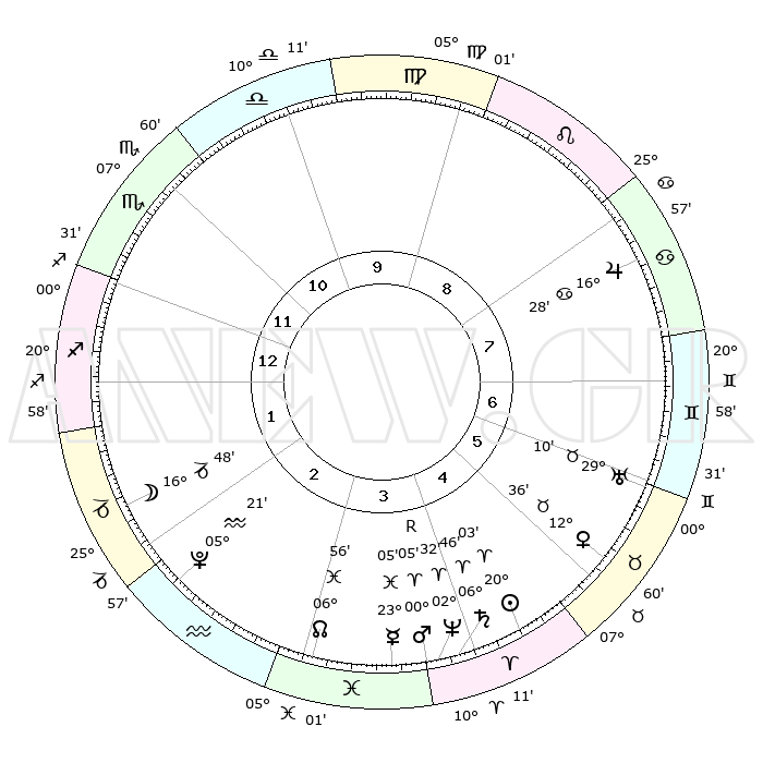 | | ΘΕΣΕΙΣ ΠΛΑΝΗΤΩΝ ΑΣΤΡΟΛΟΓΙΚΟΥ ΧΑΡΤΗ ΤΗΣ ΣΤΙΓΜΗΣ ΑΥΤΗΣ | | | | Πλανήτης | Ζώδιο | Μοίρες | Δεκαήμ. | Σε οίκο | Απόκλιση | | Ακμές των οίκων | | Ηλιος | Κριός | 19°59' | Δεύτερο | 5 | 07 N 49 | | 1ος | 27°50' | Σκορπιός | | Σελήνη | Αιγόκερως | 15°53' | Δεύτερο | 2 | 26 S 33 | | 2ος | 28°40' | Τοξότης | | Ερμής | Ιχθείς | 22°60' | Τρίτο | 4 | 04 S 55 | | 3ος | 04°01' | Υδροχόος | | Αφροδίτη | Ταύρος | 12°30' | Δεύτερο | 6 | 15 N 32 | | 4ος | 10°00' | Ιχθείς | | Αρης | Κριός | 00°01'R | Πρώτο | 4 | 00 S 55 | | 5ος | 11°18' | Κριός | | Δίας | Καρκίνος | 16°28' | Δεύτερο | 8 | 22 N 48 | | 6ος | 06°38' | Ταύρος | | Κρόνος | Κριός | 06°45' | Πρώτο | 4 | 00 N 43 | | 7ος | 27°50' | Ταύρος | | Ουρανός | Ταύρος | 29°10' | Τρίτο | 7 | 19 N 48 | | 8ος | 28°40' | Δίδυμοι | | Ποσειδώνας | Κριός | 02°32' | Πρώτο | 4 | 00 S 12 | | 9ος | 04°01' | Λέων | | Πλούτωνας | Υδροχόος | 05°21' | Πρώτο | 3 | 22 S 47 | | 10ος | 10°00' | Παρθένος | | Β. Δεσμός | Ιχθείς | 06°56' | Πρώτο | 3 | 08 S 58 | | 11ος | 11°18' | Ζυγός | | Ωροσκόπος | Σκορπιός | 27°50' | Τρίτο | | | 12ος | 06°38' | Σκορπιός | | Μεσουράνημα | Παρθένος | 10°00' | Δεύτερο | | | |