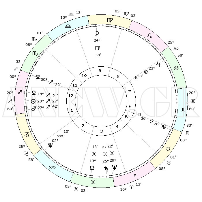 | | ΘΕΣΕΙΣ ΠΛΑΝΗΤΩΝ ΑΣΤΡΟΛΟΓΙΚΟΥ ΧΑΡΤΗ ΤΗΣ ΣΤΙΓΜΗΣ ΑΥΤΗΣ | | | | Πλανήτης | Ζώδιο | Μοίρες | Δεκαήμ. | Σε οίκο | Απόκλιση | | Ακμές των οίκων | | Ηλιος | Τοξότης | 20°22' | Τρίτο | 1 | 23 S 05 | | 1ος | 27°39' | Σκορπιός | | Σελήνη | Παρθένος | 23°40' | Τρίτο | 10 | 01 N 40 | | 2ος | 28°28' | Τοξότης | | Ερμής | Τοξότης | 00°16' | Πρώτο | 1 | 18 S 22 | | 3ος | 03°47' | Υδροχόος | | Αφροδίτη | Τοξότης | 14°15' | Δεύτερο | 1 | 22 S 14 | | 4ος | 09°46' | Ιχθείς | | Αρης | Τοξότης | 27°38' | Τρίτο | 1 | 24 S 10 | | 5ος | 11°05' | Κριός | | Δίας | Καρκίνος | 23°39'R | Τρίτο | 8 | 21 N 33 | | 6ος | 06°27' | Ταύρος | | Κρόνος | Ιχθείς | 25°27' | Τρίτο | 4 | 03 S 57 | | 7ος | 27°39' | Ταύρος | | Ουρανός | Ταύρος | 28°36'R | Τρίτο | 7 | 19 N 39 | | 8ος | 28°28' | Δίδυμοι | | Ποσειδώνας | Ιχθείς | 29°22' | Τρίτο | 4 | 01 S 29 | | 9ος | 03°47' | Λέων | | Πλούτωνας | Υδροχόος | 02°10' | Πρώτο | 2 | 23 S 20 | | 10ος | 09°46' | Παρθένος | | Β. Δεσμός | Ιχθείς | 13°13' | Δεύτερο | 4 | 06 S 36 | | 11ος | 11°05' | Ζυγός | | Ωροσκόπος | Σκορπιός | 27°39' | Τρίτο | | | 12ος | 06°27' | Σκορπιός | | Μεσουράνημα | Παρθένος | 09°46' | Πρώτο | | | |