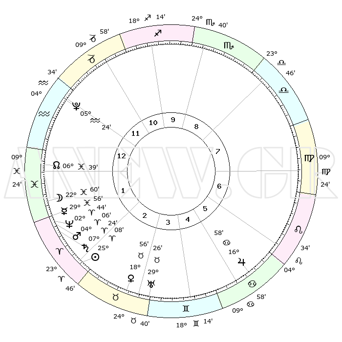 | | ΘΕΣΕΙΣ ΠΛΑΝΗΤΩΝ ΑΣΤΡΟΛΟΓΙΚΟΥ ΧΑΡΤΗ ΤΗΣ ΣΤΙΓΜΗΣ ΑΥΤΗΣ | | | | Πλανήτης | Ζώδιο | Μοίρες | Δεκαήμ. | Σε οίκο | Απόκλιση | | Ακμές των οίκων | | Ηλιος | Κριός | 25°05' | Τρίτο | 2 | 09 N 42 | | 1ος | 10°16' | Υδροχόος | | Σελήνη | Ιχθείς | 22°13' | Τρίτο | 1 | 01 S 56 | | 2ος | 25°40' | Ιχθείς | | Ερμής | Ιχθείς | 29°51' | Τρίτο | 2 | 02 S 26 | | 3ος | 02°18' | Ταύρος | | Αφροδίτη | Ταύρος | 18°52' | Δεύτερο | 3 | 17 N 36 | | 4ος | 29°07' | Ταύρος | | Αρης | Κριός | 04°04' | Πρώτο | 2 | 00 N 43 | | 5ος | 21°16' | Δίδυμοι | | Δίας | Καρκίνος | 16°58' | Δεύτερο | 6 | 22 N 44 | | 6ος | 13°12' | Καρκίνος | | Κρόνος | Κριός | 07°23' | Πρώτο | 2 | 00 N 58 | | 7ος | 10°16' | Λέων | | Ουρανός | Ταύρος | 29°25' | Τρίτο | 4 | 19 N 51 | | 8ος | 25°40' | Παρθένος | | Ποσειδώνας | Κριός | 02°44' | Πρώτο | 2 | 00 S 07 | | 9ος | 02°18' | Σκορπιός | | Πλούτωνας | Υδροχόος | 05°24' | Πρώτο | 12 | 22 S 47 | | 10ος | 29°07' | Σκορπιός | | Β. Δεσμός | Ιχθείς | 06°40' | Πρώτο | 1 | 09 S 04 | | 11ος | 21°16' | Τοξότης | | Ωροσκόπος | Υδροχόος | 10°16' | Δεύτερο | | | 12ος | 13°12' | Αιγόκερως | | Μεσουράνημα | Σκορπιός | 29°07' | Τρίτο | | | |