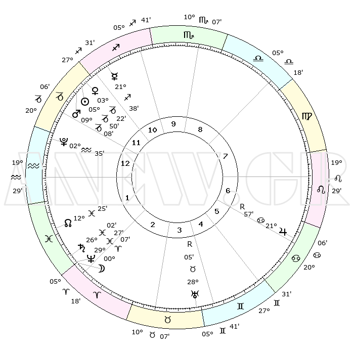 | | ΘΕΣΕΙΣ ΠΛΑΝΗΤΩΝ ΑΣΤΡΟΛΟΓΙΚΟΥ ΧΑΡΤΗ ΤΗΣ ΣΤΙΓΜΗΣ ΑΥΤΗΣ | | | | Πλανήτης | Ζώδιο | Μοίρες | Δεκαήμ. | Σε οίκο | Απόκλιση | | Ακμές των οίκων | | Ηλιος | Αιγόκερως | 05°45' | Πρώτο | 12 | 23 S 18 | | 1ος | 17°53' | Αιγόκερως | | Σελήνη | Ιχθείς | 29°09' | Τρίτο | 2 | 01 N 06 | | 2ος | 29°31' | Υδροχόος | | Ερμής | Τοξότης | 21°31' | Τρίτο | 11 | 23 S 11 | | 3ος | 09°26' | Κριός | | Αφροδίτη | Αιγόκερως | 03°16' | Πρώτο | 12 | 23 S 43 | | 4ος | 10°07' | Ταύρος | | Αρης | Αιγόκερως | 09°05' | Πρώτο | 12 | 23 S 59 | | 5ος | 03°60' | Δίδυμοι | | Δίας | Καρκίνος | 21°57'R | Τρίτο | 7 | 21 N 52 | | 6ος | 25°12' | Δίδυμοι | | Κρόνος | Ιχθείς | 26°02' | Τρίτο | 2 | 03 S 40 | | 7ος | 17°53' | Καρκίνος | | Ουρανός | Ταύρος | 28°05'R | Τρίτο | 4 | 19 N 32 | | 8ος | 29°31' | Λέων | | Ποσειδώνας | Ιχθείς | 29°27' | Τρίτο | 2 | 01 S 27 | | 9ος | 09°26' | Ζυγός | | Πλούτωνας | Υδροχόος | 02°35' | Πρώτο | 1 | 23 S 15 | | 10ος | 10°07' | Σκορπιός | | Β. Δεσμός | Ιχθείς | 12°25' | Δεύτερο | 2 | 06 S 54 | | 11ος | 03°60' | Τοξότης | | Ωροσκόπος | Αιγόκερως | 17°53' | Δεύτερο | | | 12ος | 25°12' | Τοξότης | | Μεσουράνημα | Σκορπιός | 10°07' | Δεύτερο | | | |