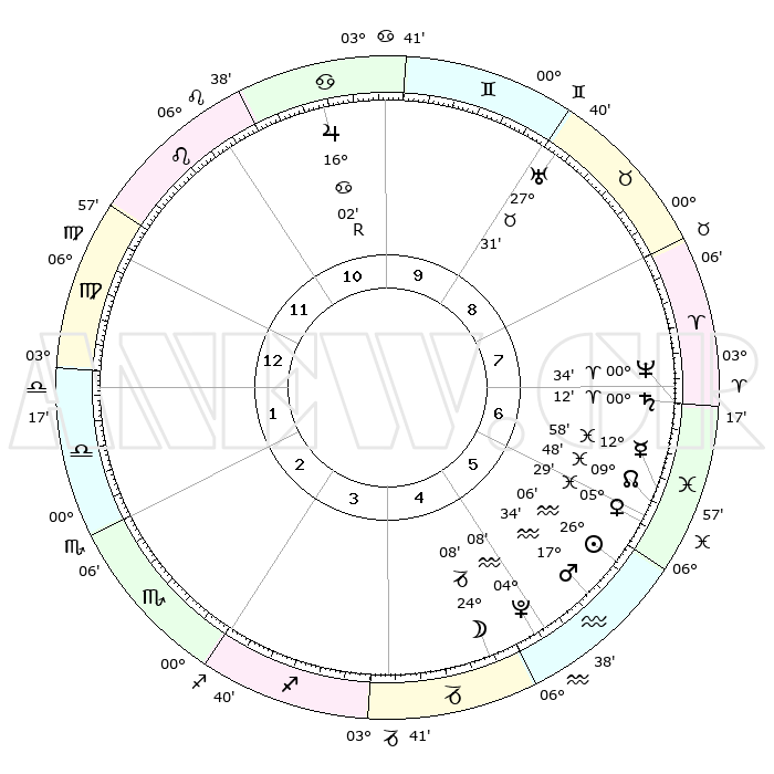 | | ΘΕΣΕΙΣ ΠΛΑΝΗΤΩΝ ΑΣΤΡΟΛΟΓΙΚΟΥ ΧΑΡΤΗ ΤΗΣ ΣΤΙΓΜΗΣ ΑΥΤΗΣ | | | | Πλανήτης | Ζώδιο | Μοίρες | Δεκαήμ. | Σε οίκο | Απόκλιση | | Ακμές των οίκων | | Ηλιος | Υδροχόος | 26°02' | Τρίτο | 6 | 12 S 50 | | 1ος | 15°04' | Παρθένος | | Σελήνη | Αιγόκερως | 23°22' | Τρίτο | 5 | 25 S 08 | | 2ος | 10°26' | Ζυγός | | Ερμής | Ιχθείς | 12°53' | Δεύτερο | 6 | 06 S 44 | | 3ος | 10°12' | Σκορπιός | | Αφροδίτη | Ιχθείς | 05°24' | Πρώτο | 6 | 10 S 54 | | 4ος | 13°08' | Τοξότης | | Αρης | Υδροχόος | 17°31' | Δεύτερο | 5 | 16 S 36 | | 5ος | 16°29' | Αιγόκερως | | Δίας | Καρκίνος | 16°03'R | Δεύτερο | 10 | 22 N 48 | | 6ος | 17°32' | Υδροχόος | | Κρόνος | Κριός | 00°12' | Πρώτο | 7 | 01 S 54 | | 7ος | 15°04' | Ιχθείς | | Ουρανός | Ταύρος | 27°30' | Τρίτο | 9 | 19 N 25 | | 8ος | 10°26' | Κριός | | Ποσειδώνας | Κριός | 00°33' | Πρώτο | 7 | 00 S 59 | | 9ος | 10°12' | Ταύρος | | Πλούτωνας | Υδροχόος | 04°08' | Πρώτο | 5 | 22 S 57 | | 10ος | 13°08' | Δίδυμοι | | Β. Δεσμός | Ιχθείς | 09°48' | Πρώτο | 6 | 07 S 54 | | 11ος | 16°29' | Καρκίνος | | Ωροσκόπος | Παρθένος | 15°04' | Δεύτερο | | | 12ος | 17°32' | Λέων | | Μεσουράνημα | Δίδυμοι | 13°08' | Δεύτερο | | | |