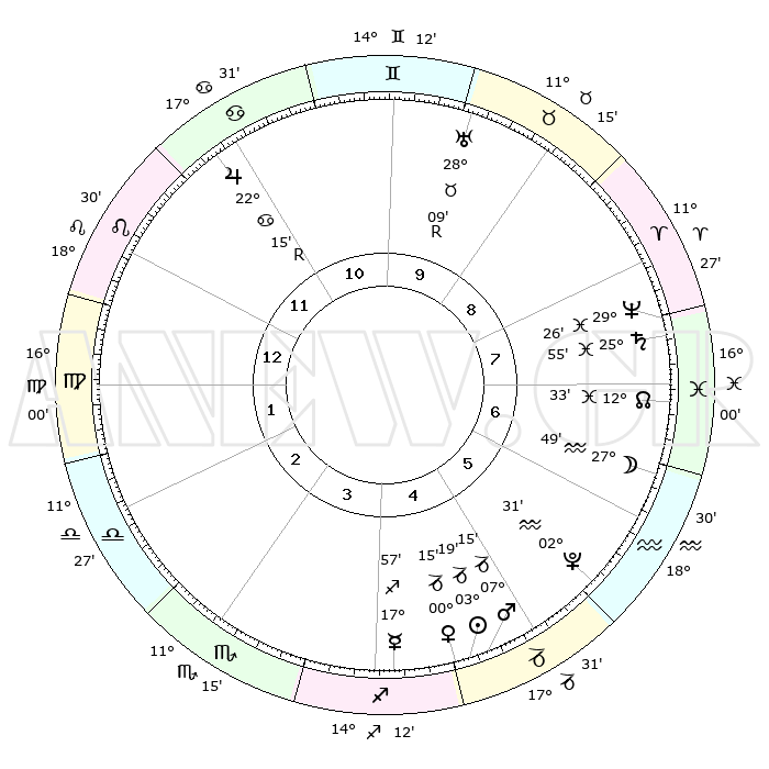 | | ΘΕΣΕΙΣ ΠΛΑΝΗΤΩΝ ΑΣΤΡΟΛΟΓΙΚΟΥ ΧΑΡΤΗ ΤΗΣ ΣΤΙΓΜΗΣ ΑΥΤΗΣ | | | | Πλανήτης | Ζώδιο | Μοίρες | Δεκαήμ. | Σε οίκο | Απόκλιση | | Ακμές των οίκων | | Ηλιος | Αιγόκερως | 03°14' | Πρώτο | 5 | 23 S 24 | | 1ος | 21°17' | Λέων | | Σελήνη | Υδροχόος | 26°44' | Τρίτο | 7 | 13 S 48 | | 2ος | 14°13' | Παρθένος | | Ερμής | Τοξότης | 17°50' | Δεύτερο | 4 | 22 S 36 | | 3ος | 12°01' | Ζυγός | | Αφροδίτη | Αιγόκερως | 00°09' | Πρώτο | 5 | 23 S 40 | | 4ος | 14°44' | Σκορπιός | | Αρης | Αιγόκερως | 07°12' | Πρώτο | 5 | 24 S 05 | | 5ος | 19°33' | Τοξότης | | Δίας | Καρκίνος | 22°16'R | Τρίτο | 11 | 21 N 49 | | 6ος | 22°18' | Αιγόκερως | | Κρόνος | Ιχθείς | 25°54' | Τρίτο | 8 | 03 S 43 | | 7ος | 21°17' | Υδροχόος | | Ουρανός | Ταύρος | 28°09'R | Τρίτο | 10 | 19 N 33 | | 8ος | 14°13' | Ιχθείς | | Ποσειδώνας | Ιχθείς | 29°26' | Τρίτο | 8 | 01 S 27 | | 9ος | 12°01' | Κριός | | Πλούτωνας | Υδροχόος | 02°31' | Πρώτο | 6 | 23 S 16 | | 10ος | 14°44' | Ταύρος | | Β. Δεσμός | Ιχθείς | 12°33' | Δεύτερο | 7 | 06 S 51 | | 11ος | 19°33' | Δίδυμοι | | Ωροσκόπος | Λέων | 21°17' | Τρίτο | | | 12ος | 22°18' | Καρκίνος | | Μεσουράνημα | Ταύρος | 14°44' | Δεύτερο | | | |