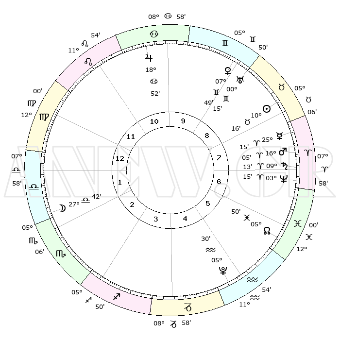 | | ΘΕΣΕΙΣ ΠΛΑΝΗΤΩΝ ΑΣΤΡΟΛΟΓΙΚΟΥ ΧΑΡΤΗ ΤΗΣ ΣΤΙΓΜΗΣ ΑΥΤΗΣ | | | | Πλανήτης | Ζώδιο | Μοίρες | Δεκαήμ. | Σε οίκο | Απόκλιση | | Ακμές των οίκων | | Ηλιος | Ταύρος | 10°13' | Δεύτερο | 8 | 14 N 53 | | 1ος | 23°50' | Παρθένος | | Σελήνη | Ζυγός | 27°07' | Τρίτο | 2 | 14 S 03 | | 2ος | 19°57' | Ζυγός | | Ερμής | Κριός | 25°10' | Τρίτο | 8 | 07 N 54 | | 3ος | 20°09' | Σκορπιός | | Αφροδίτη | Δίδυμοι | 07°46' | Πρώτο | 9 | 22 N 28 | | 4ος | 23°05' | Τοξότης | | Αρης | Κριός | 16°03' | Δεύτερο | 7 | 05 N 29 | | 5ος | 26°10' | Αιγόκερως | | Δίας | Καρκίνος | 18°51' | Δεύτερο | 10 | 22 N 30 | | 6ος | 26°50' | Υδροχόος | | Κρόνος | Κριός | 09°13' | Πρώτο | 7 | 01 N 39 | | 7ος | 23°50' | Ιχθείς | | Ουρανός | Δίδυμοι | 00°15' | Πρώτο | 9 | 20 N 02 | | 8ος | 19°57' | Κριός | | Ποσειδώνας | Κριός | 03°15' | Πρώτο | 7 | 00 N 05 | | 9ος | 20°09' | Ταύρος | | Πλούτωνας | Υδροχόος | 05°30' | Πρώτο | 5 | 22 S 49 | | 10ος | 23°05' | Δίδυμοι | | Β. Δεσμός | Ιχθείς | 05°50' | Πρώτο | 6 | 09 S 22 | | 11ος | 26°10' | Καρκίνος | | Ωροσκόπος | Παρθένος | 23°50' | Τρίτο | | | 12ος | 26°50' | Λέων | | Μεσουράνημα | Δίδυμοι | 23°05' | Τρίτο | | | |