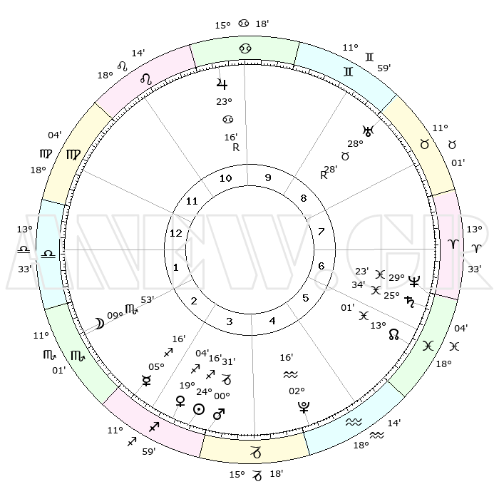 | | ΘΕΣΕΙΣ ΠΛΑΝΗΤΩΝ ΑΣΤΡΟΛΟΓΙΚΟΥ ΧΑΡΤΗ ΤΗΣ ΣΤΙΓΜΗΣ ΑΥΤΗΣ | | | | Πλανήτης | Ζώδιο | Μοίρες | Δεκαήμ. | Σε οίκο | Απόκλιση | | Ακμές των οίκων | | Ηλιος | Τοξότης | 23°25' | Τρίτο | 1 | 23 S 16 | | 1ος | 28°13' | Σκορπιός | | Σελήνη | Ζυγός | 29°53' | Τρίτο | 11 | 14 S 51 | | 2ος | 29°06' | Τοξότης | | Ερμής | Τοξότης | 04°08' | Πρώτο | 1 | 19 S 28 | | 3ος | 04°31' | Υδροχόος | | Αφροδίτη | Τοξότης | 18°01' | Δεύτερο | 1 | 22 S 44 | | 4ος | 10°31' | Ιχθείς | | Αρης | Τοξότης | 29°53' | Τρίτο | 2 | 24 S 12 | | 5ος | 11°46' | Κριός | | Δίας | Καρκίνος | 23°21'R | Τρίτο | 8 | 21 N 36 | | 6ος | 07°03' | Ταύρος | | Κρόνος | Ιχθείς | 25°32' | Τρίτο | 4 | 03 S 54 | | 7ος | 28°13' | Ταύρος | | Ουρανός | Ταύρος | 28°29'R | Τρίτο | 7 | 19 N 37 | | 8ος | 29°06' | Δίδυμοι | | Ποσειδώνας | Ιχθείς | 29°23' | Τρίτο | 4 | 01 S 29 | | 9ος | 04°31' | Λέων | | Πλούτωνας | Υδροχόος | 02°15' | Πρώτο | 2 | 23 S 19 | | 10ος | 10°31' | Παρθένος | | Β. Δεσμός | Ιχθείς | 13°04' | Δεύτερο | 4 | 06 S 39 | | 11ος | 11°46' | Ζυγός | | Ωροσκόπος | Σκορπιός | 28°13' | Τρίτο | | | 12ος | 07°03' | Σκορπιός | | Μεσουράνημα | Παρθένος | 10°31' | Δεύτερο | | | |